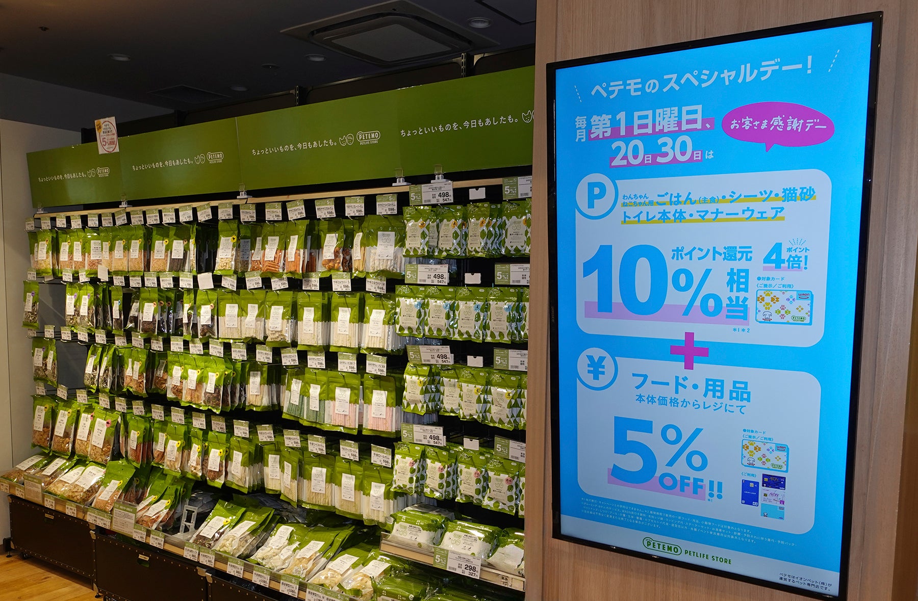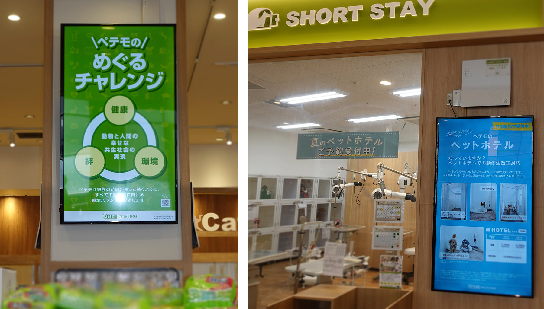 もっと統一していこうという動きがありまして、店舗名を”PETEMO(ペテモ)”に統一して、合わせてポスターなどの販促情報もデジタルサイネージにすることで