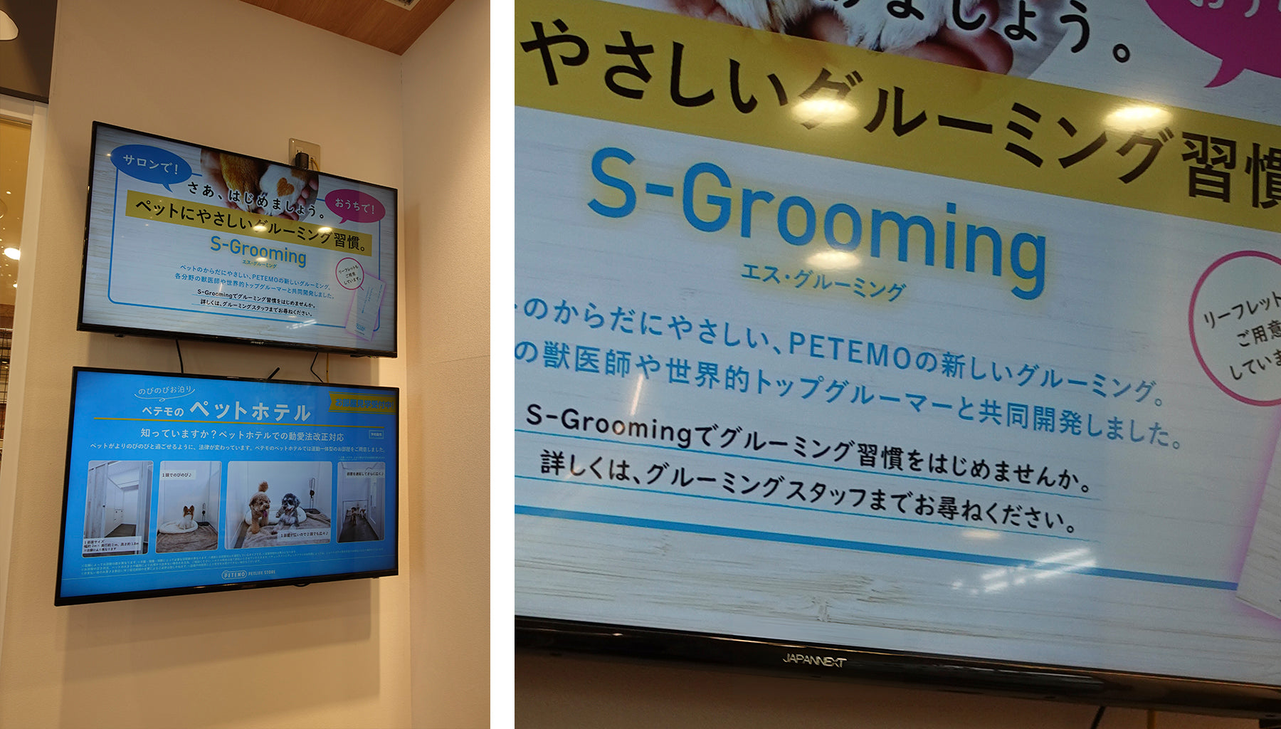 コンテンツ配信の仕組みも出来ましたので、”PETEMO(ペテモ)”の動物病院やグルーミングサロンといった場所でもサイネージ展開を広げていきました。