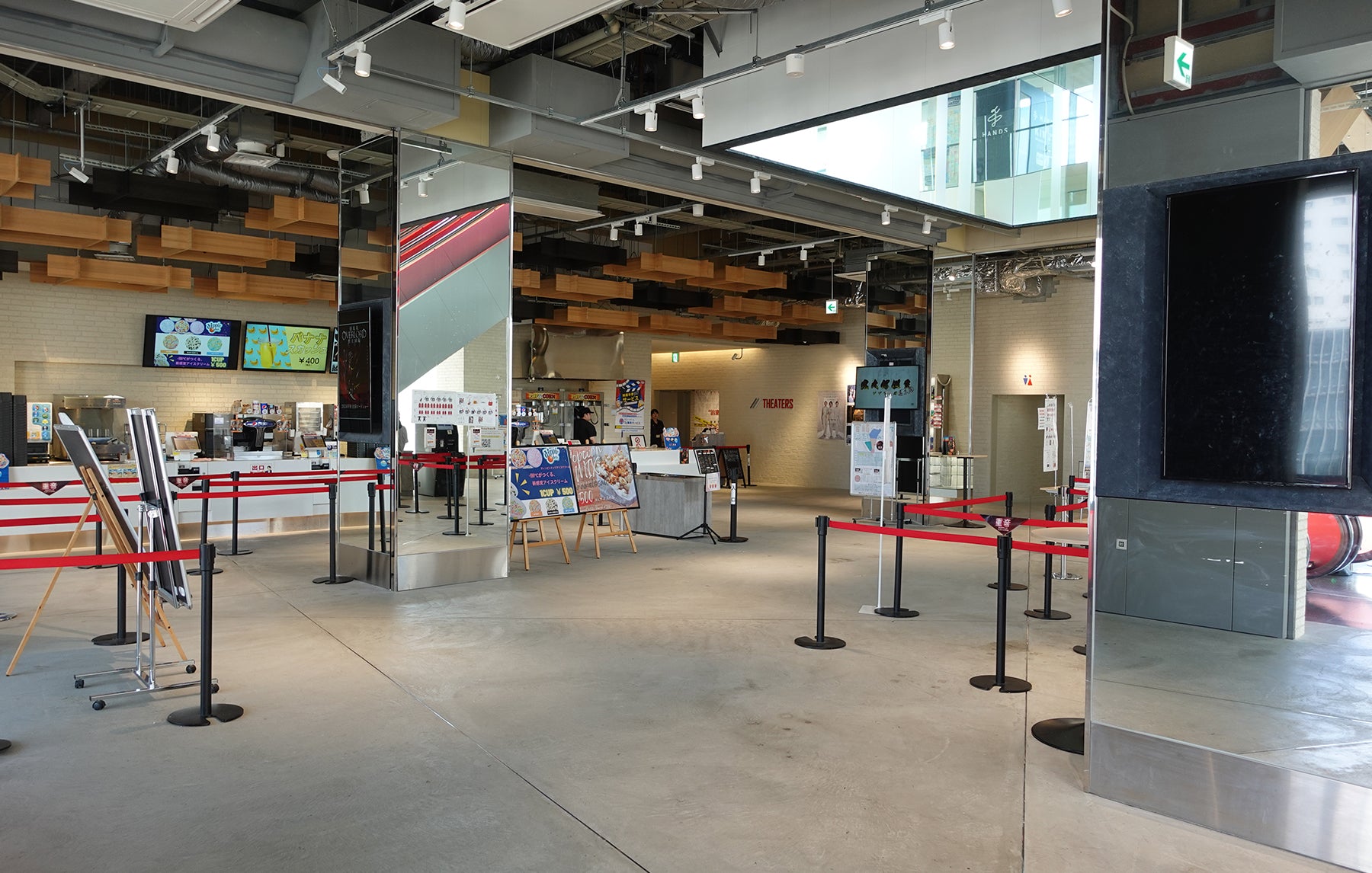 ロビーには98インチモニターで予告動画、55インチモニターでポスターを表示させている。