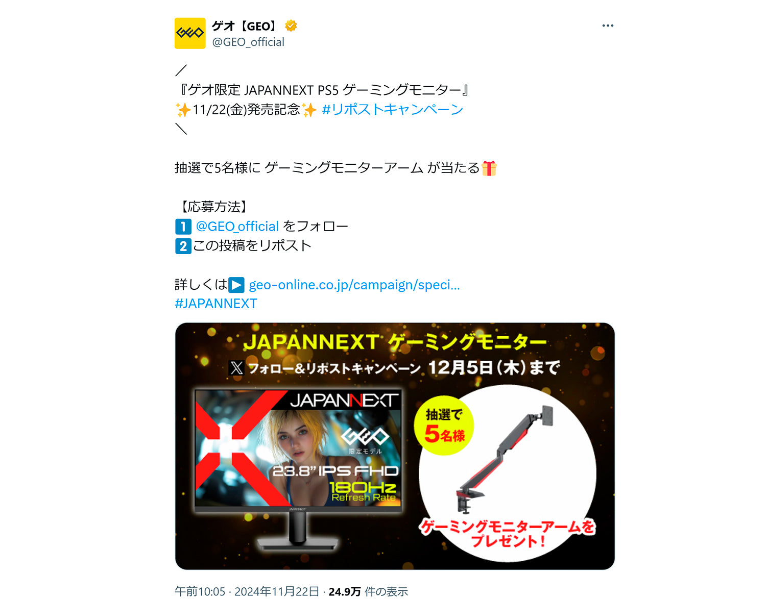 2024年11月に発売したゲオ限定ゲーミングモニター