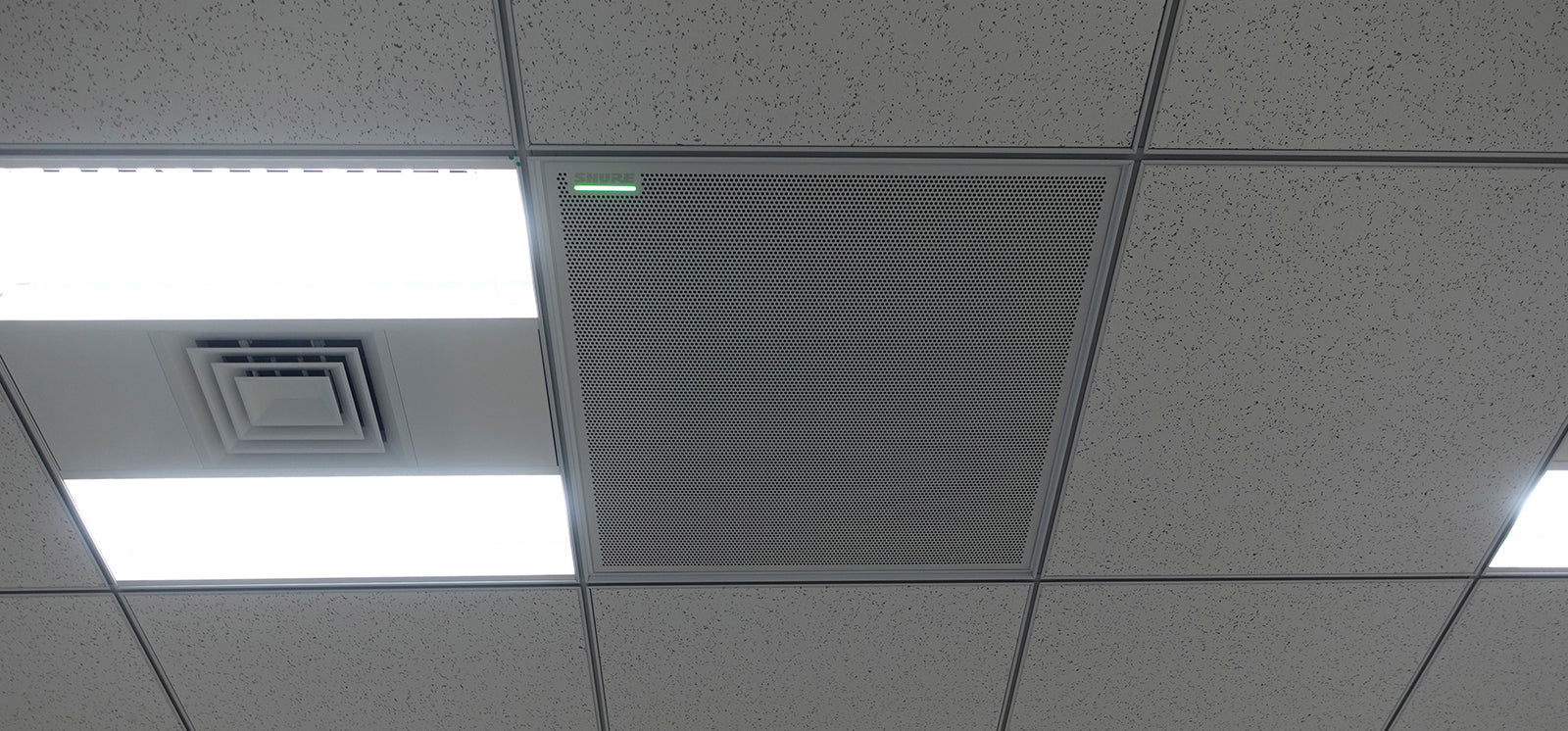 天井に埋め込まれたマイクで会議室全体の音を集音し、会議室内でも離れた場所のスピーカーで増幅して出力する「ボイスリフト」機能により座る場所による聞こえにくさなども解消している。
