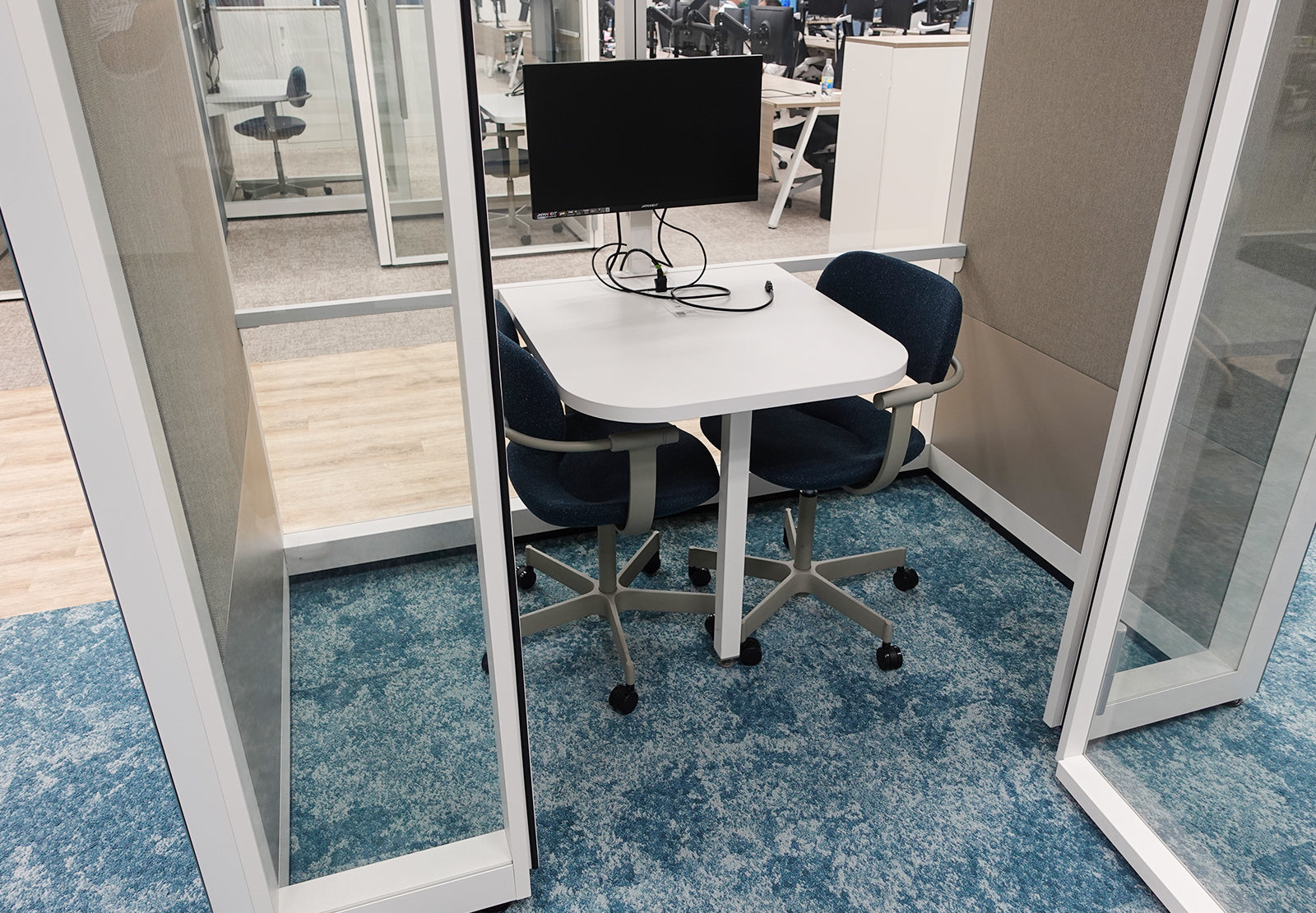 また、社員が業務を行うスペースはフリーアドレスとし、USB-C給電対応のモニターを採用しました。これにより、社員は好きなデスクに座ってUSB-Cを接続するだけで給電と画像出力が1本で仕事が可能となり、ノートPCの電源アダプターを持ち運ぶ必要がなくなりました。