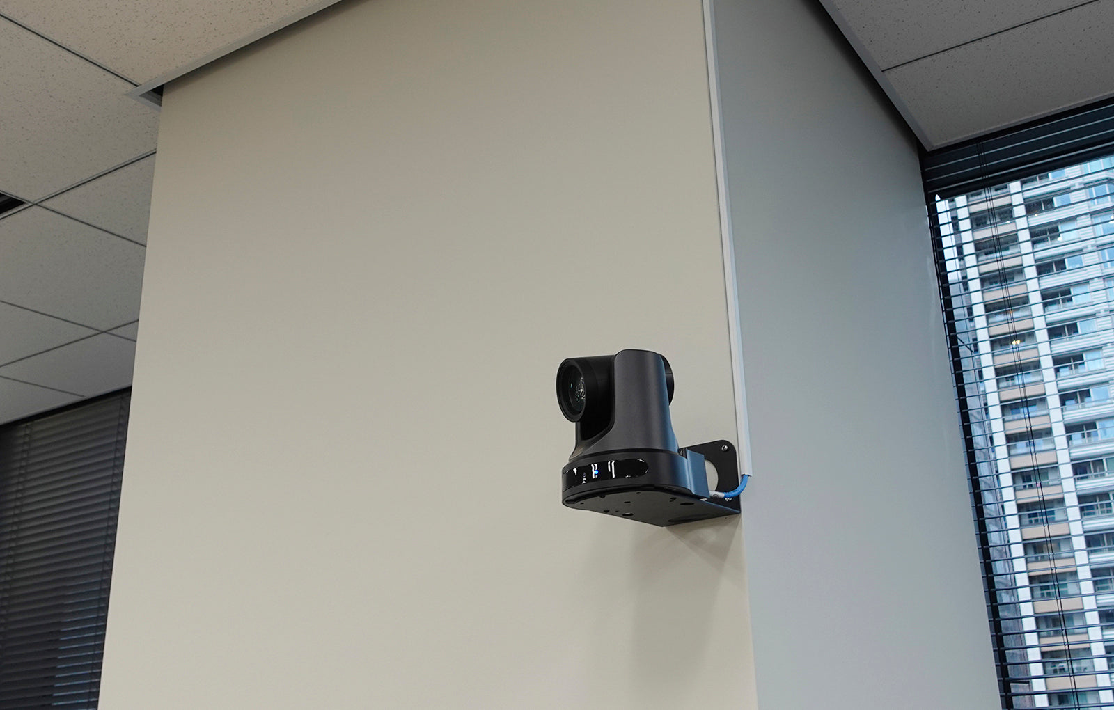 360度カメラは発言者の音声をマイクで認識し自動的に方向を決め、その後カメラのAI機能により発言者へフォーカスし参加者に見えるように配信される。天井からのアングルだとやや自然ではないので高さを低く設置し、より臨場感を出している。