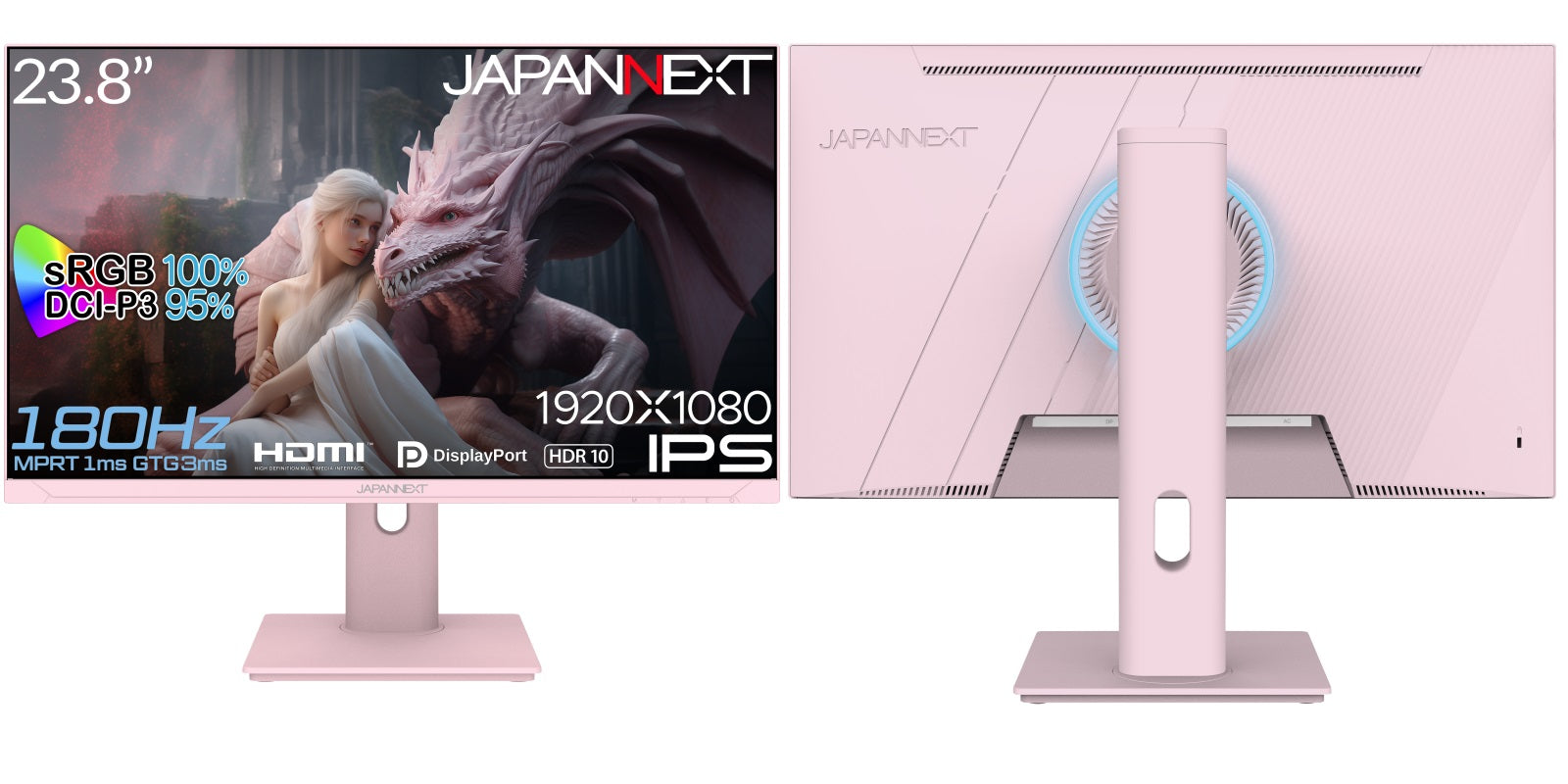 23.8インチのIPSパネルを搭載、180Hzの高速リフレッシュレートに対応し、本体にパステルピンクカラーを採用したフルHD(1920 x 1080)解像度のゲーミングモニターです。パステルピンクカラーを本体に採用。