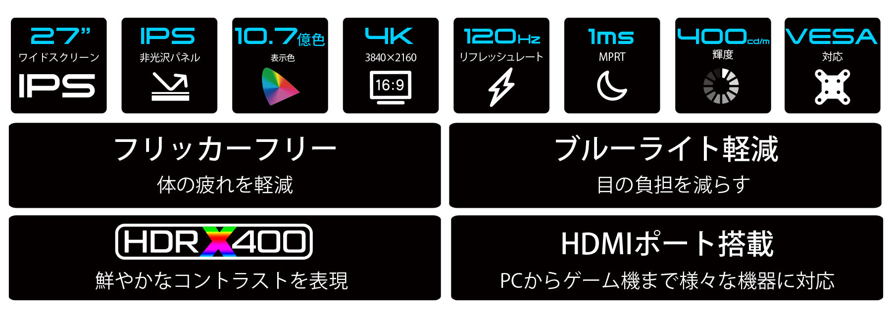 27インチのIPSパネルを搭載した、4K(3840×2160)解像度のゲーミングモニターです。4KはフルHD(1920×1080)解像度の約4倍の作業領域を実現する3840×2160ドットの解像度となり、高精細な表示を実現します。ゲームプレイ時だけでなく、デスクワークに使用時にも高い生産性を実現できます。
