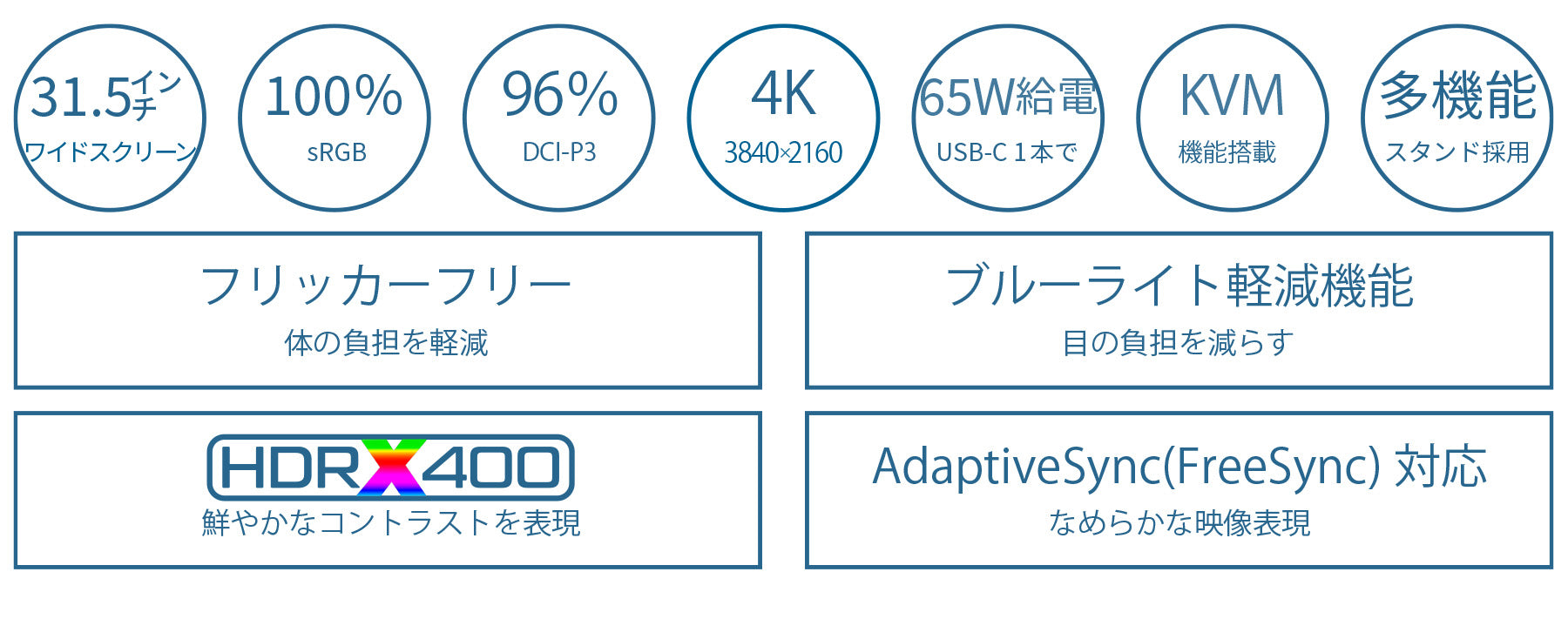 31.5インチのIPSパネルを搭載し、4K(3840x2160)解像度に対応した液晶モニターです。フルHD(1920x1080)の4倍の高解像度は複数のウィンドウの同時表示を可能にし、圧倒的な高生産性を実現します。
