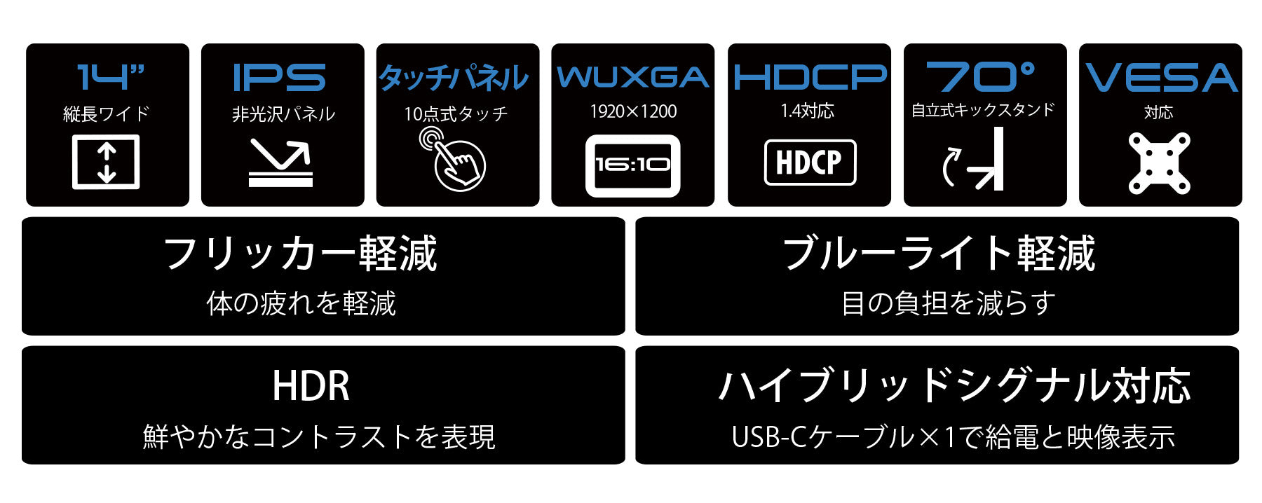 14インチのIPSパネルを搭載し、WUXGA(1920×1200)解像度に対応したモバイルディスプレイです。あらゆる角度から見ても色やコントラストの変化がおきにくいIPSパネルを搭載し、広視野角上下左右170°を実現します。