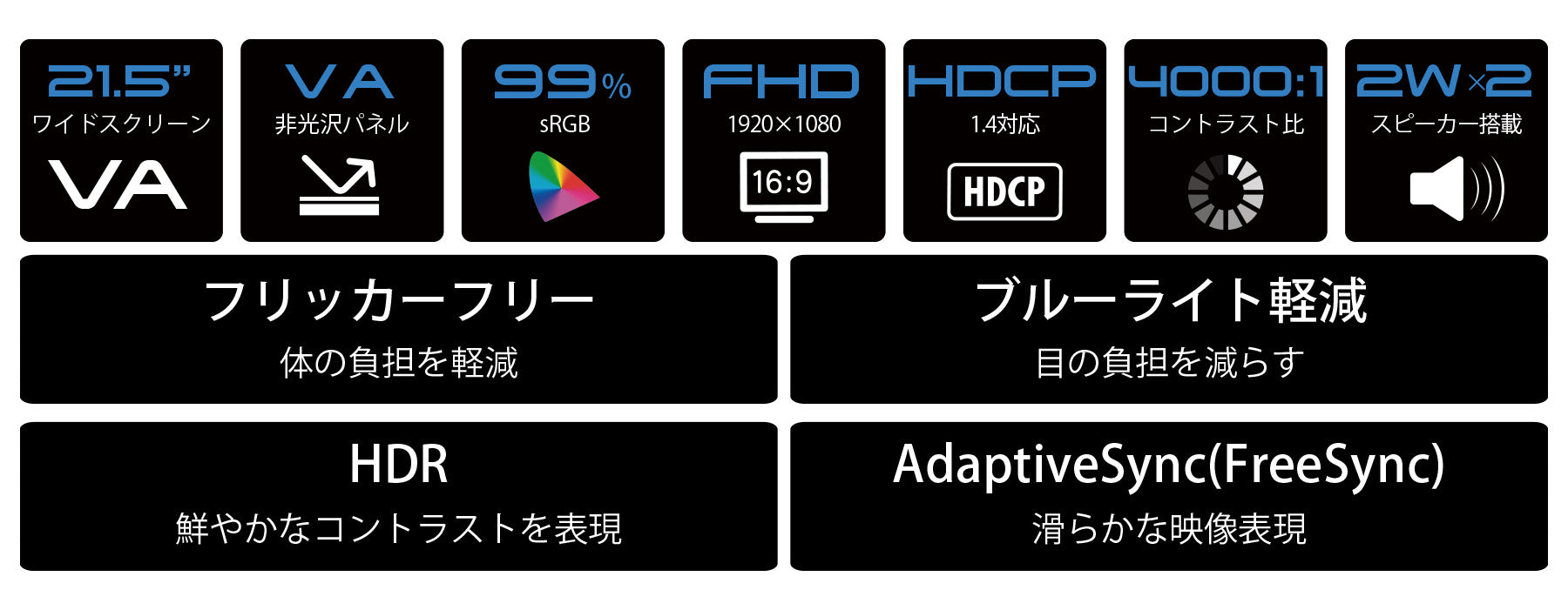 21.5インチのVAパネルを搭載し、フルHD(1920×1080)解像度に対応した液晶モニターです。高画質VAパネルは、4000:1の高コントラスト比により黒が引き締まり、メリハリのある映像を実現します。