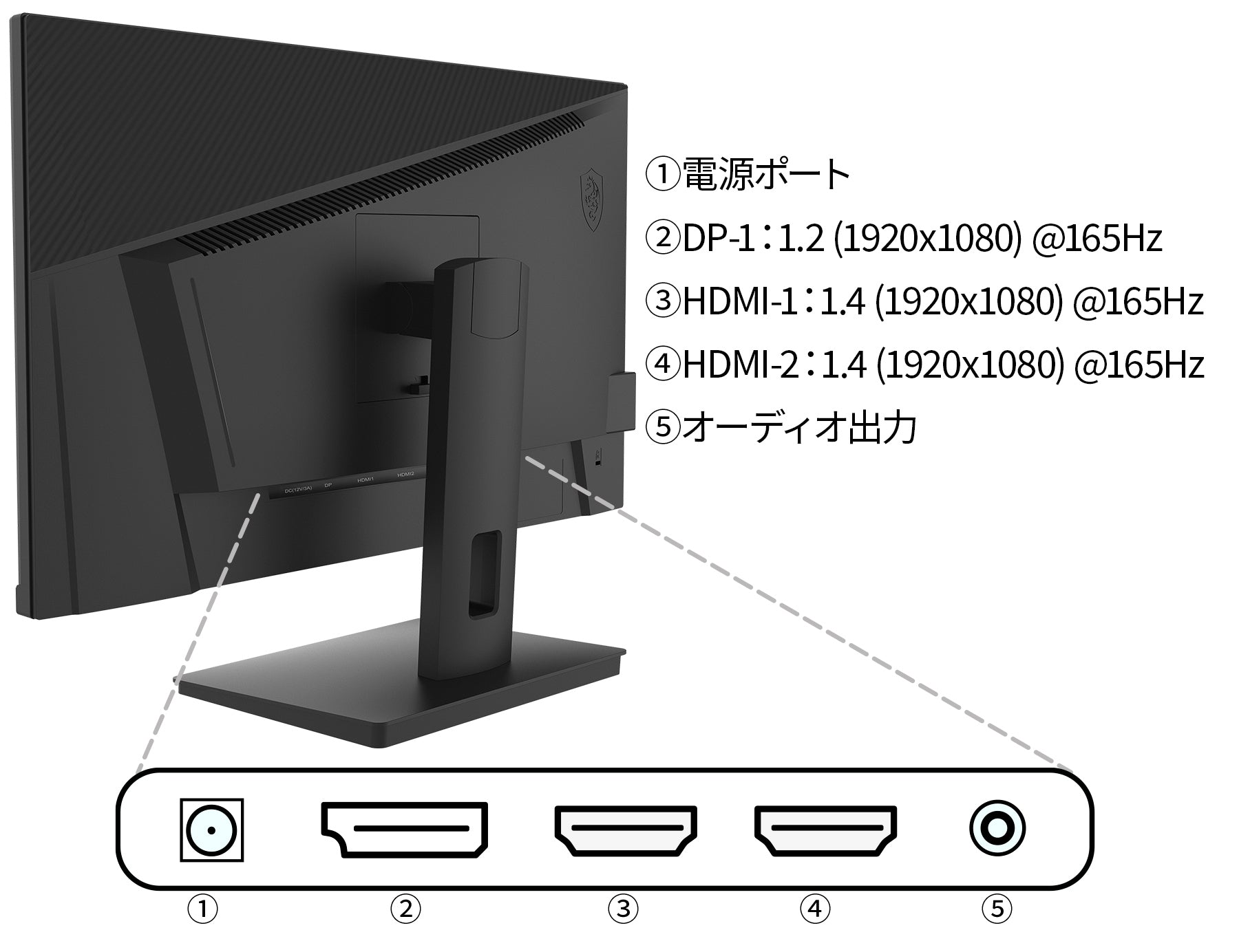 インターフェイスはHDMI 1.4 (165Hz) x2、DisplayPort 1.2(165Hz) x1を装備、ゲーム機やパソコンだけでなく、様々な機器との接続が可能です。