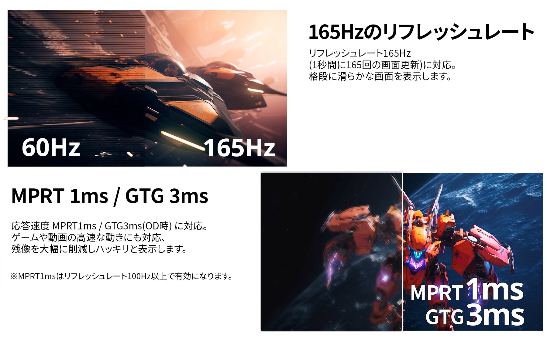 高速リフレッシュレート/165Hz、応答速度/MPRT:1ms GTG:3ms対応、PS5 /120Hz接続