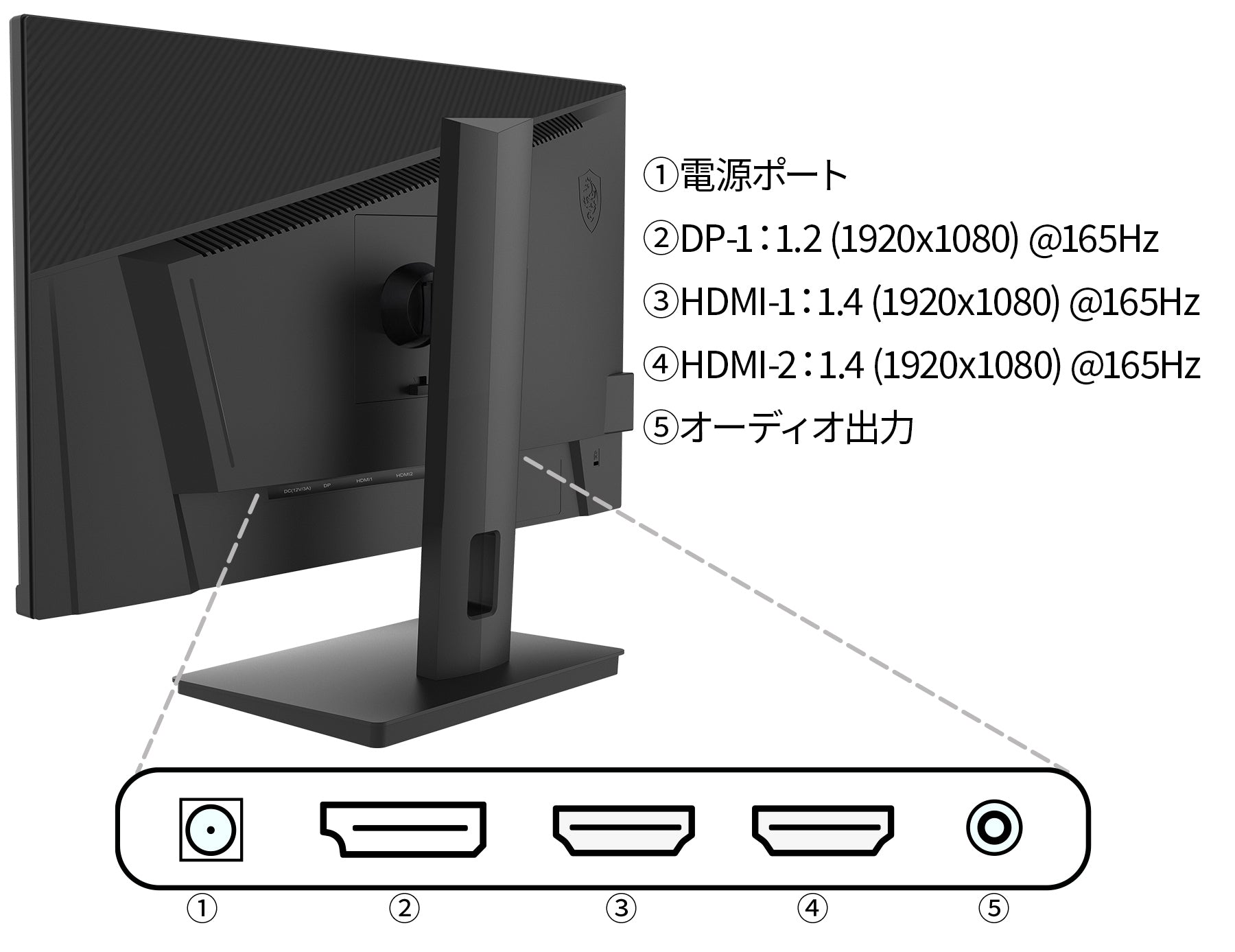インターフェイスはHDMI 1.4(165Hz) x2、DisplayPort 1.2 (165Hz) x1を装備、ゲーム機やパソコンだけでなく、様々な機器との接続が可能です。