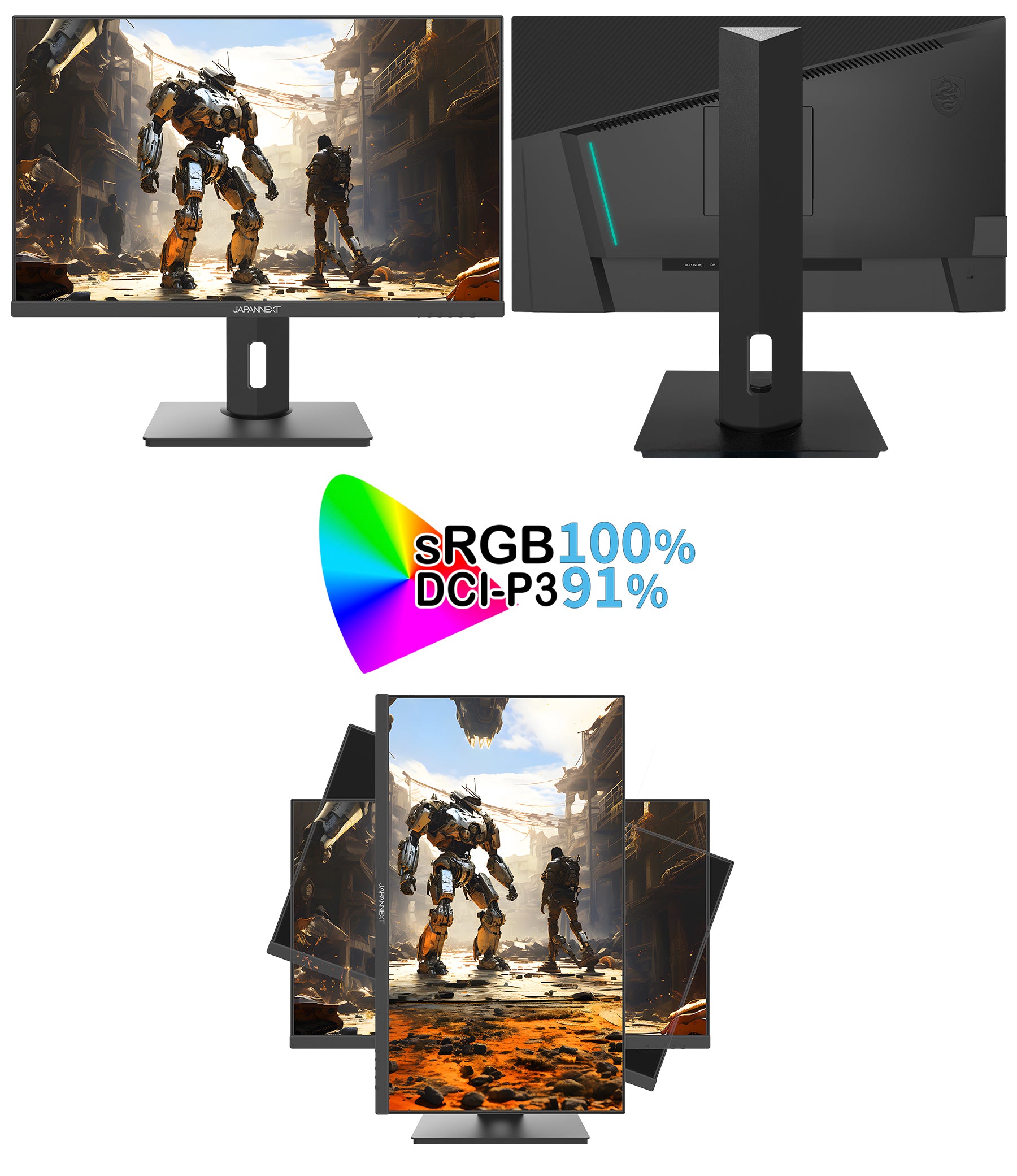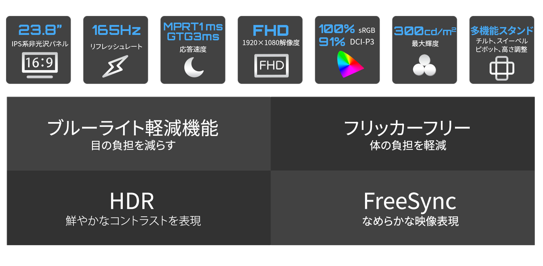23.8インチのフルHD(1920 x 1080) 解像度 IPSパネルを採用。1ms(MPRT)*の高速応答速度と165Hzの高速リフレッシュレートとIPSならではの色鮮やかな映像表現を実現。高輝度300cd/m2の高輝度液晶はsRGB100%、DCI-P3 91%の広色域に対応、ゲームプレイや動画鑑賞だけでなく、写真や動画の編集作業などにも最適です。