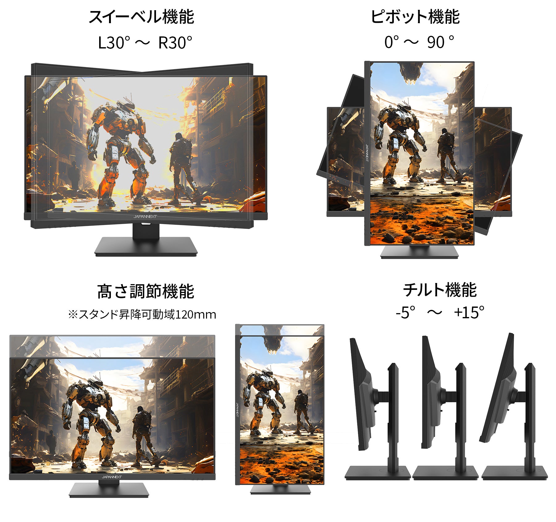 昇降式スタンドを採用、120mmの範囲(横置時)で高さ調節が可能です。また左右90度まで回転して縦画面でも使用できるピボット機能も装備します。