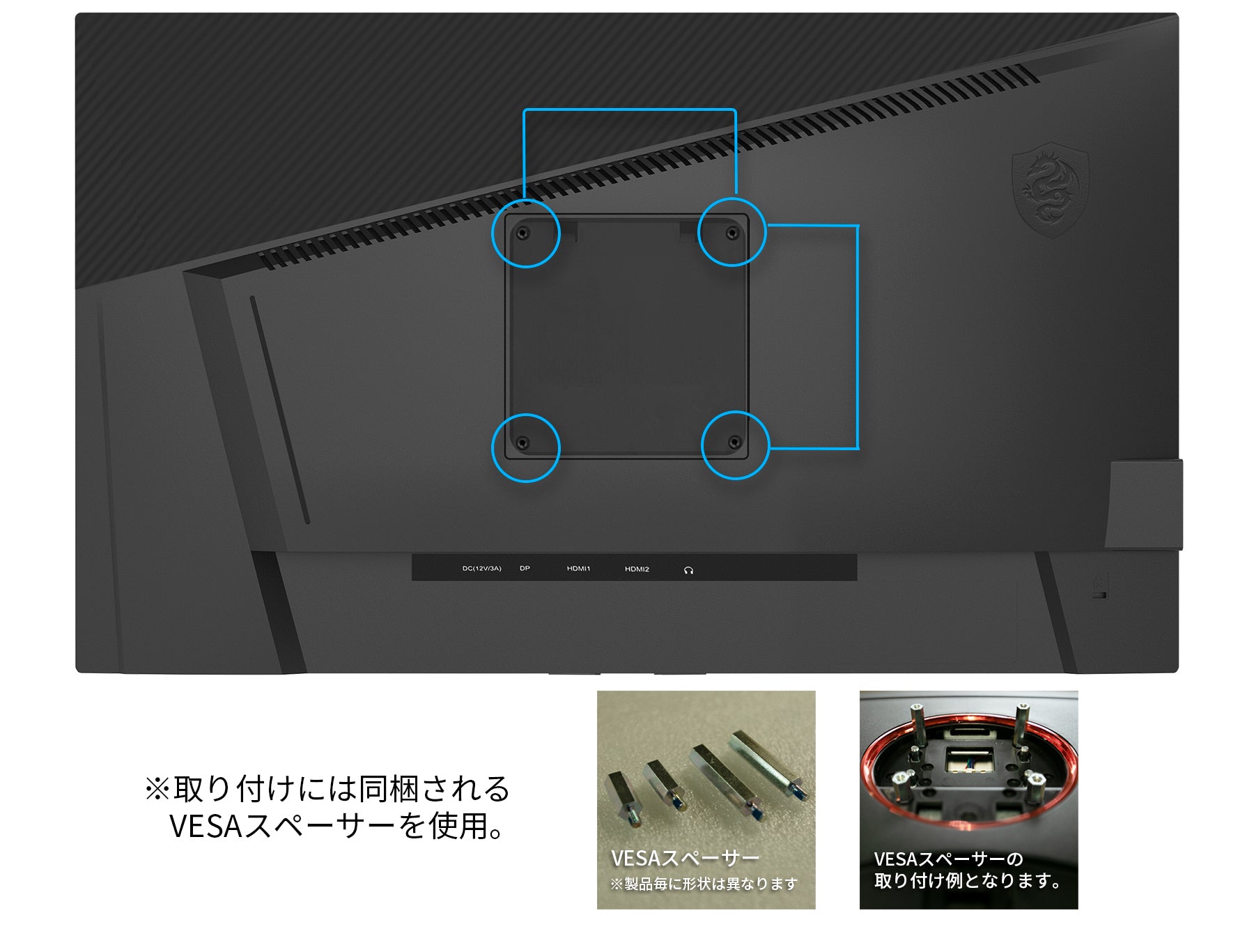 付属スタンドを取り外し、同梱されるVESAスペーサーを使用することによりアームや壁掛け金物を取り付けることができます。