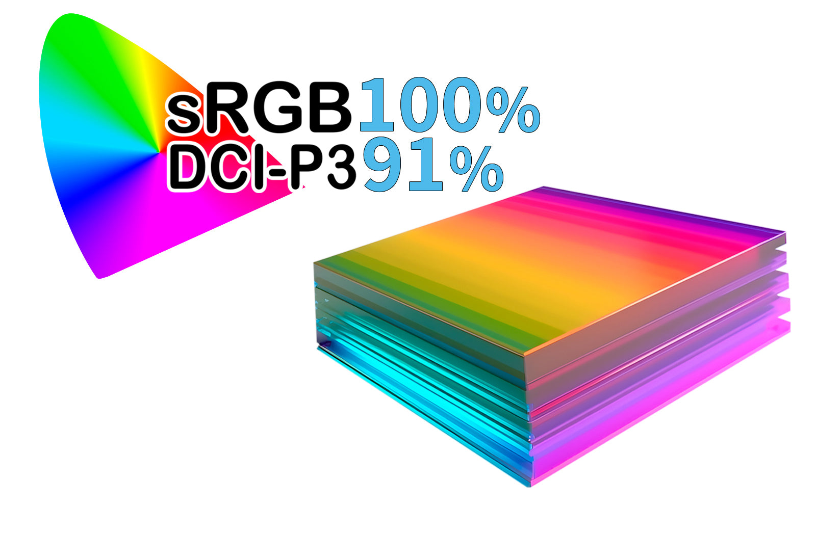 sRGB:100%、DCI-P3:91%の高性能パネルが画像を鮮やかな色彩でくっきりと表示します。
