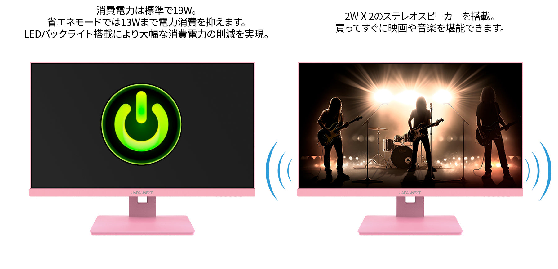 また2W x2のスピーカーを内蔵します。100mmx100mmのVESAマウントに対応、別売のモニターアームやモニタースタンドへの取り付けが可能です。