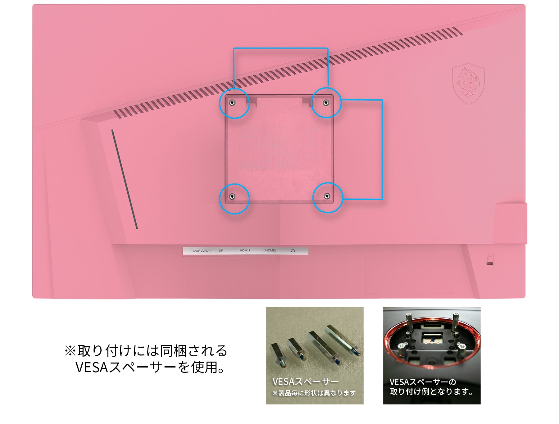 付属スタンドを取り外し、同梱されるVESAスペーサーを使用することによりアームや壁掛け金物を取り付けることができます。