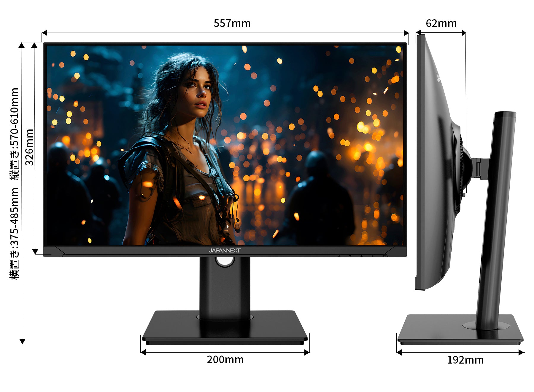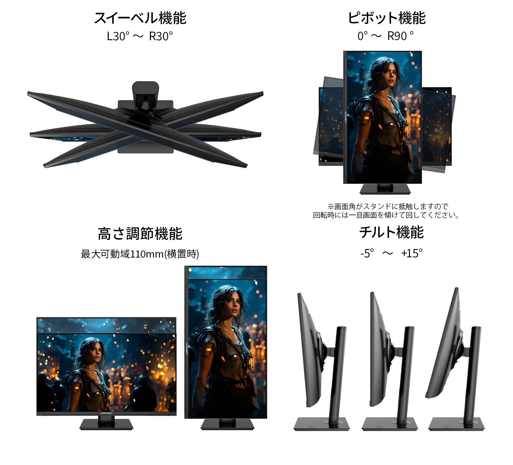 昇降式スタンドを採用、110mmの範囲(横置時)で高さ調節が可能です。また縦画面として使用出来るピボット(回転)機能にも対応します。