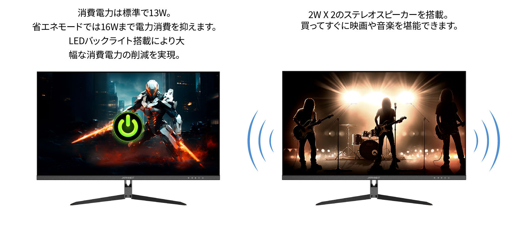 モニター画面のフリッカー(ちらつき)、およびブルーライト(青色光)を軽減、目の負担を軽くします。100mmx100mmのVESAマウントに対応、別売のモニターアームやモニタースタンドへの取り付けが可能です。