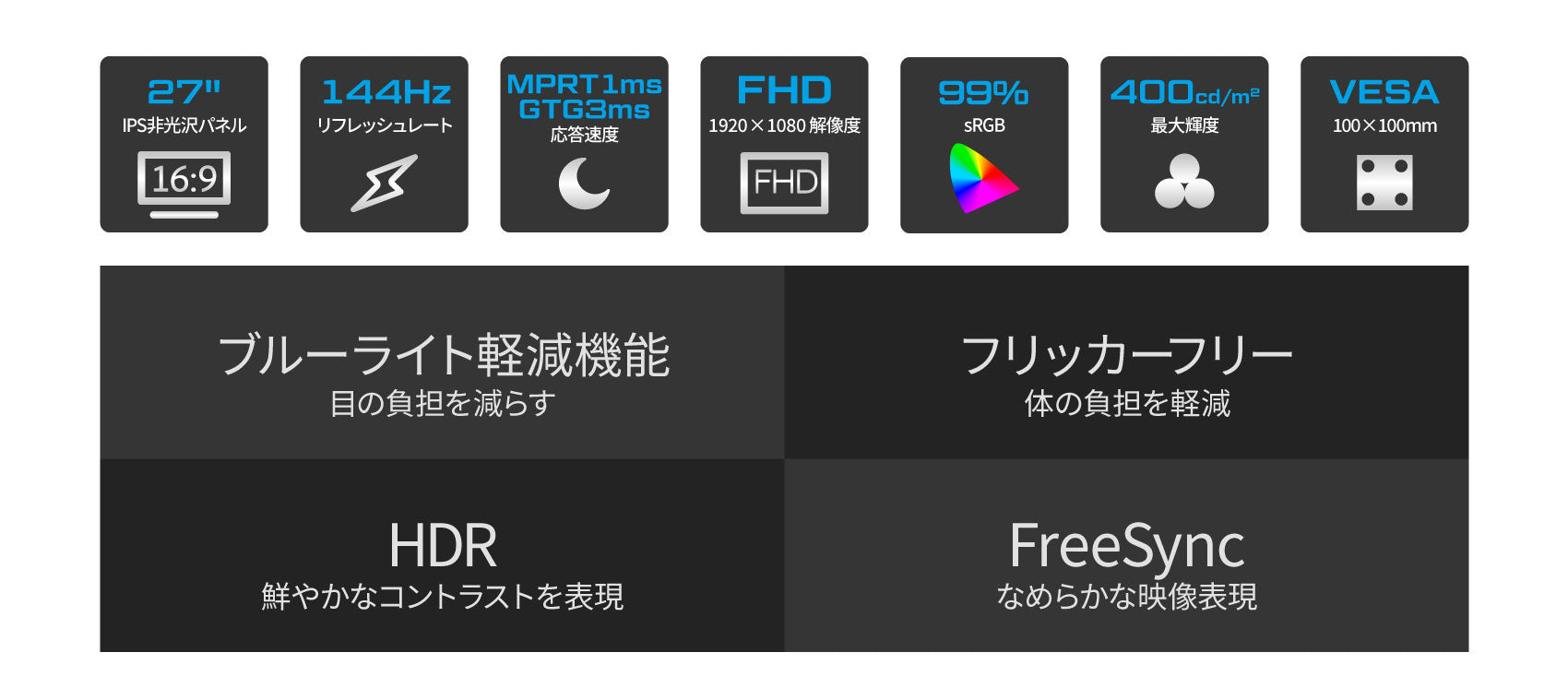27インチのフルHD(1920 x 1080) 解像度 IPSパネルを採用し、1ms(MPRT)*の高速応答速度と144Hzの高速リフレッシュレートに対応。IPSならではの色鮮やかな映像表現を実現した高輝度400cd/m2の高輝度液晶はsRGB99%の広色域に対応、ゲームプレイや動画鑑賞だけでなく、写真や動画の編集作業などにも最適です。*MPRT 1msはリフレッシュレート75Hz以上で有効