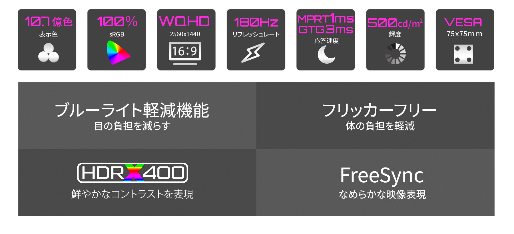 リフレッシュレート:180Hz / 応答速度MPRT:1ms / GTG:3ms