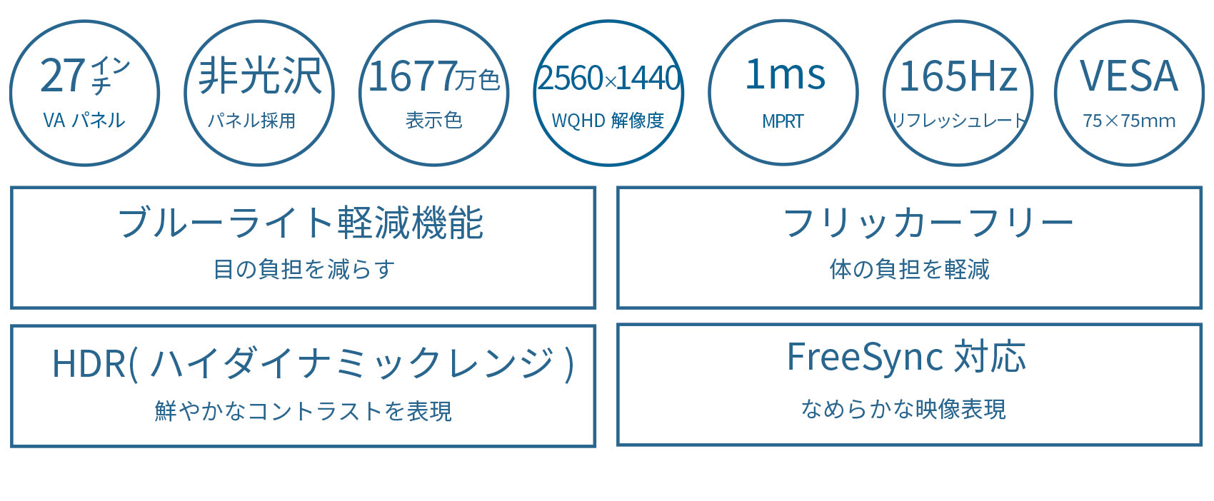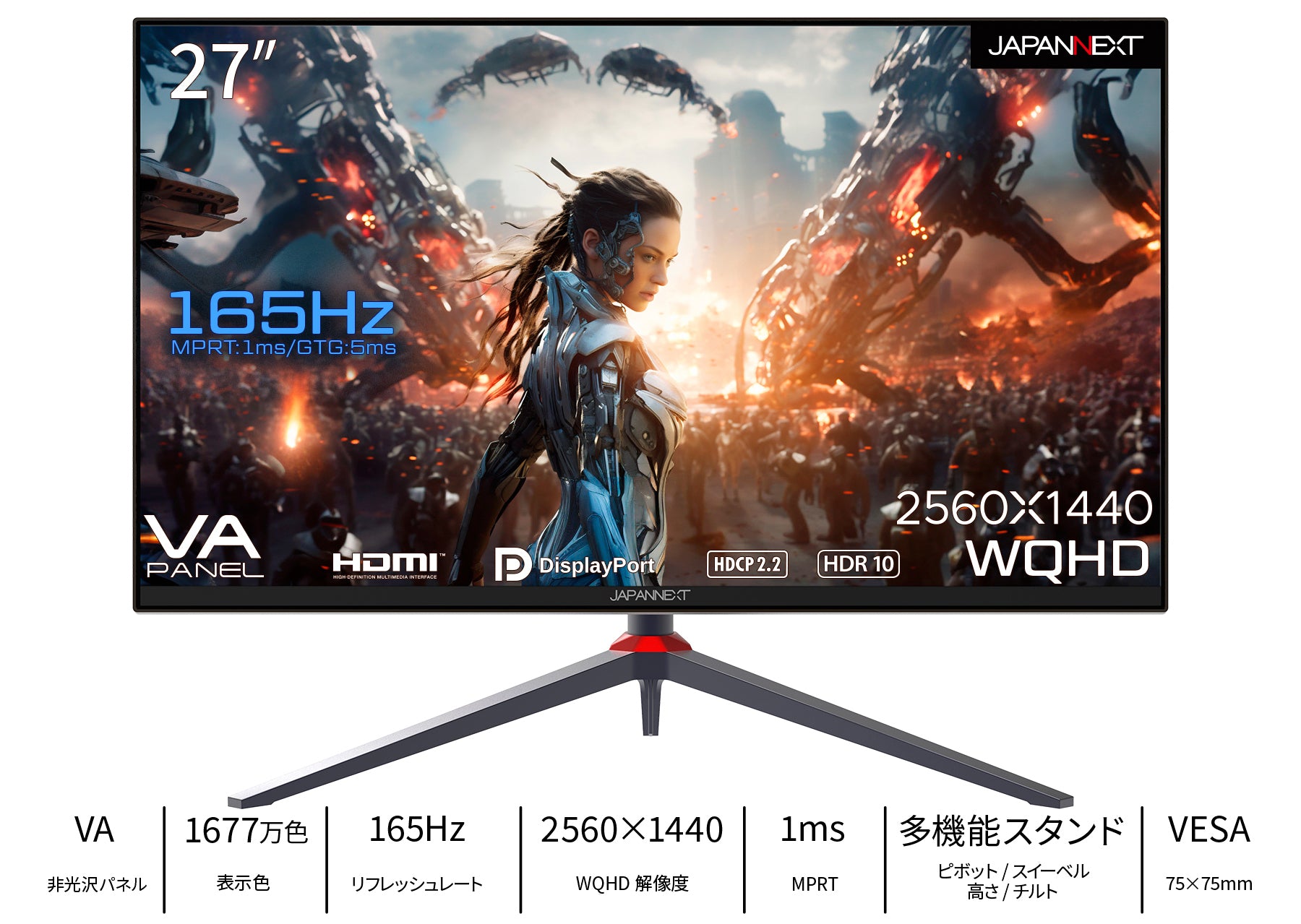 27インチのWQHD(2560x1440)解像度のVAパネルを搭載、165Hzのリフレッシュレート、AMD FreeSyncに対応した高解像度ゲーミングモニターです。