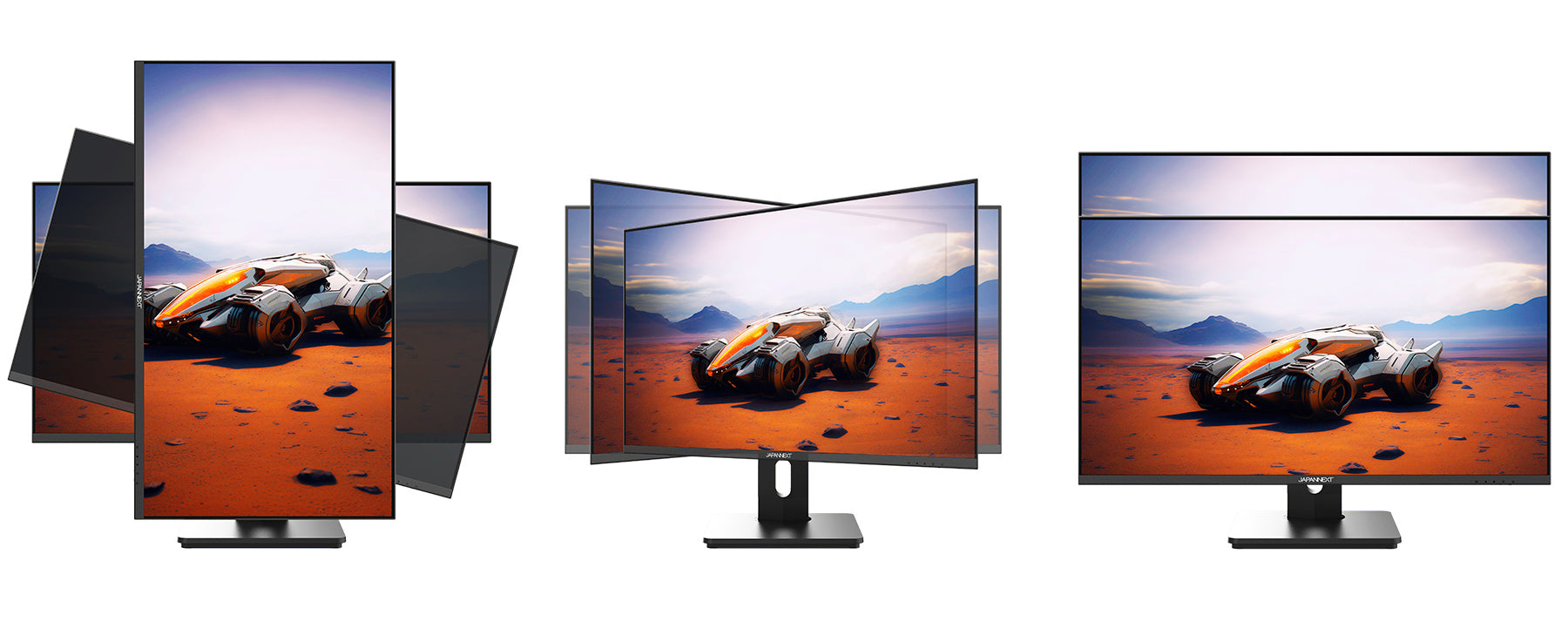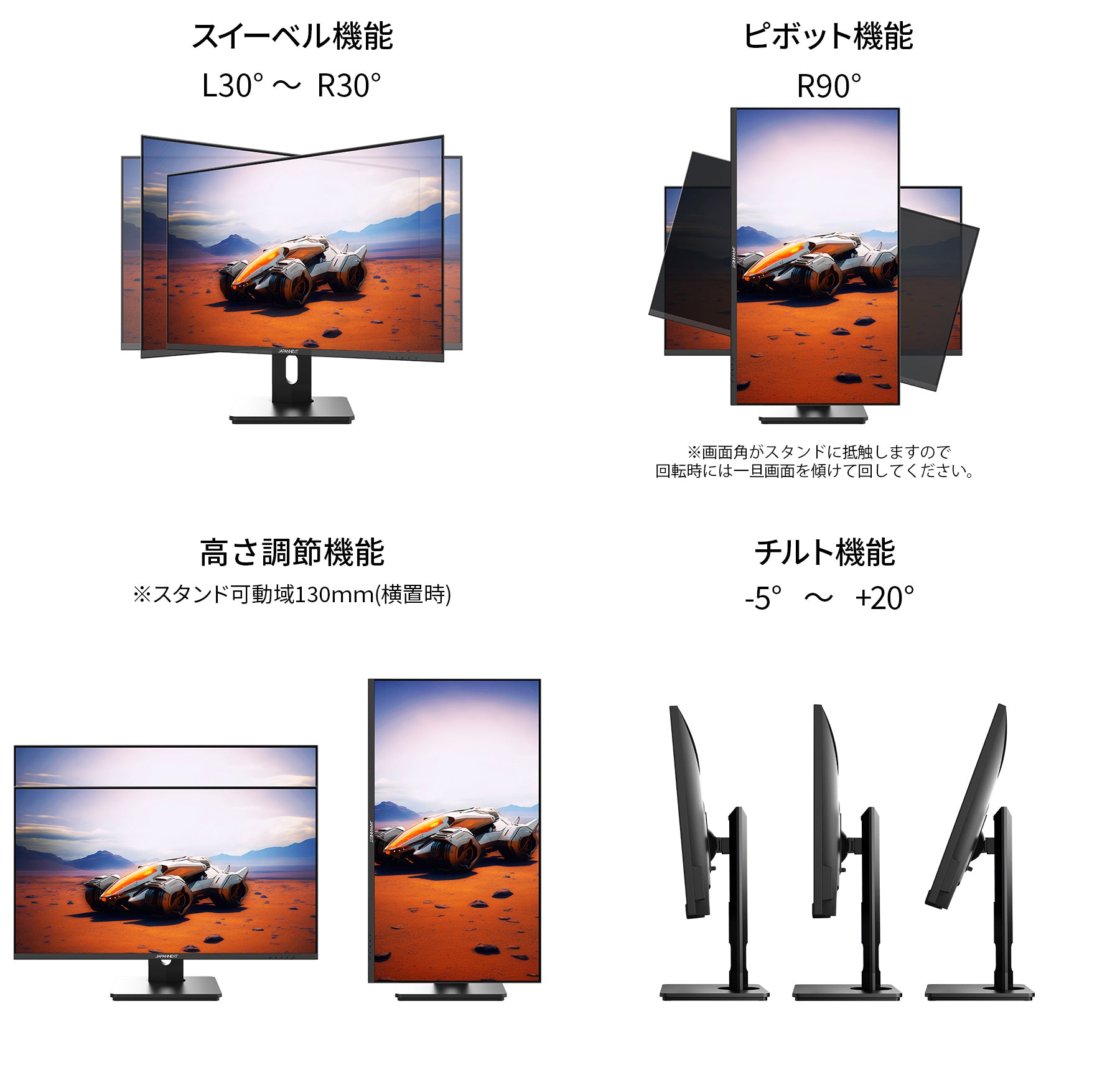 高さ調整が可能な昇降式多機能スタンドを搭載、最大130mmの範囲(横置時)で最適な高さに画面を調整可能です。また、縦画面として使用出来るピボット(回転)機能にも対応します。スイーベル(首振り)機能は、左右各30°の範囲で動かせます。