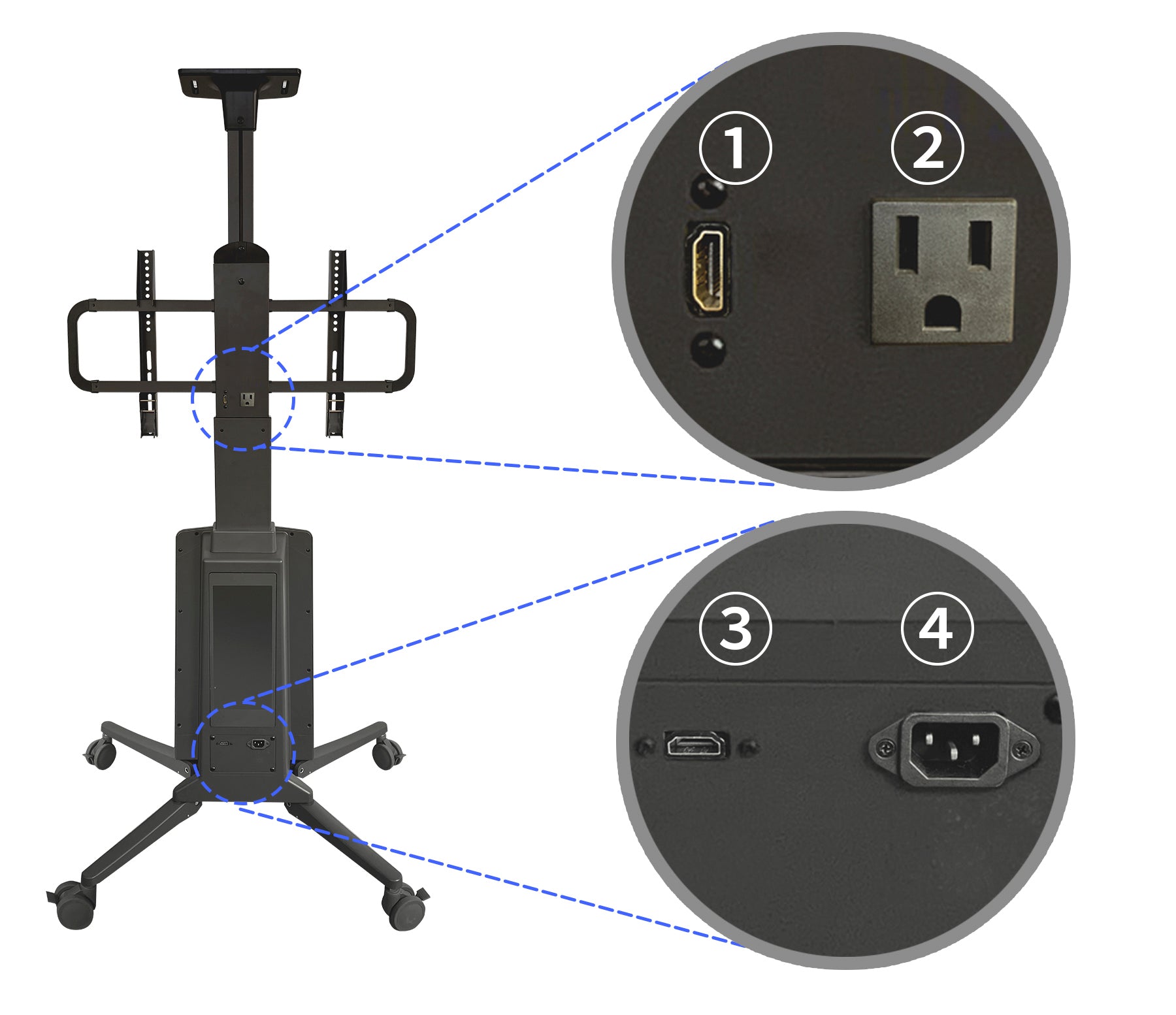 ➀HDMI出力 ➁電源出力 ③HDMI入力 ④電源ポート