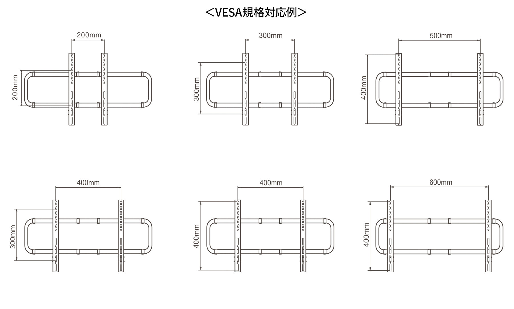 横 : 130~600mm(無段階)、縦 : 50~400mm (15mm間隔) の範囲内で、様々なVESA規格のモニターに取り付けが可能です。