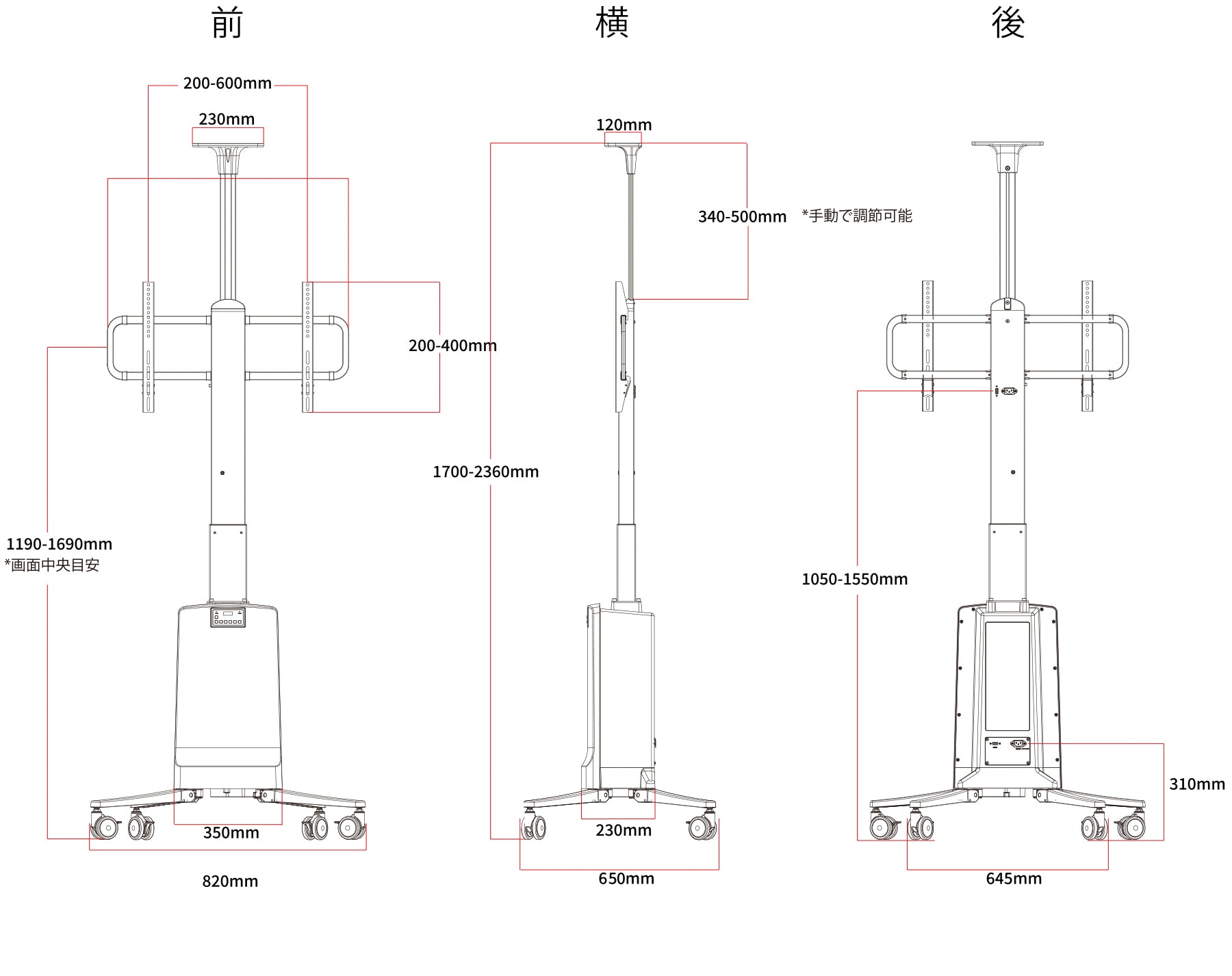 本製品は、最大75インチまでのデジタルサイネージを設置可能で、電動で高さ調整が可能な大型液晶モニタースタンドです。
