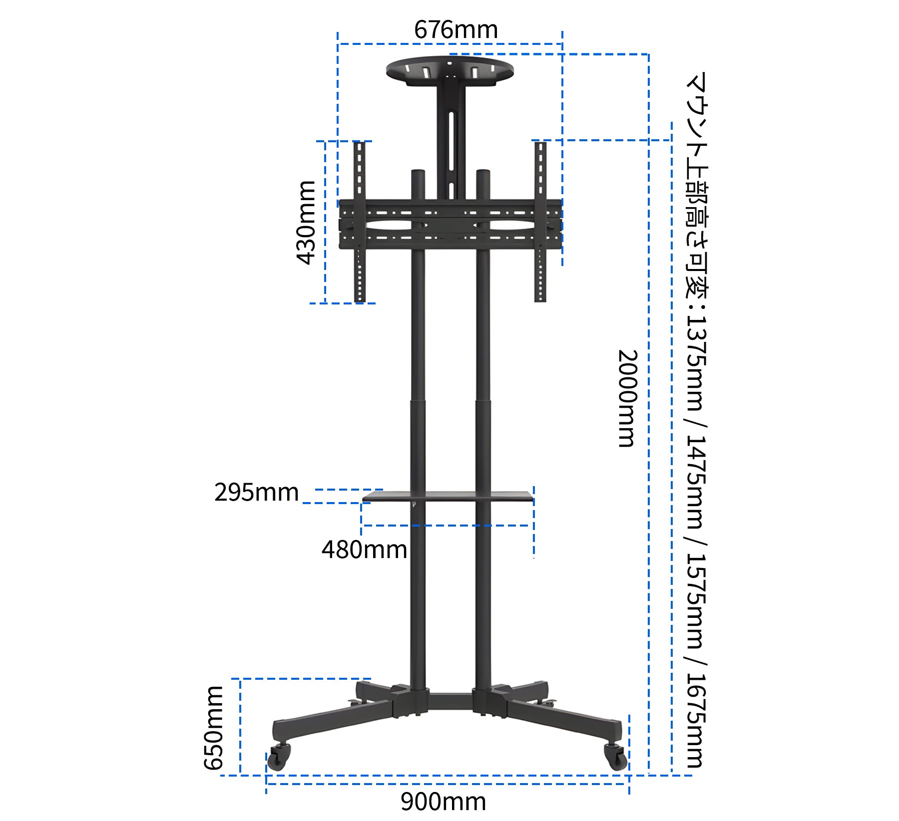 大型テレビも設置可能なテレビスタンド、32~65型テレビに対応。高さ調整機能、キャスター付き。