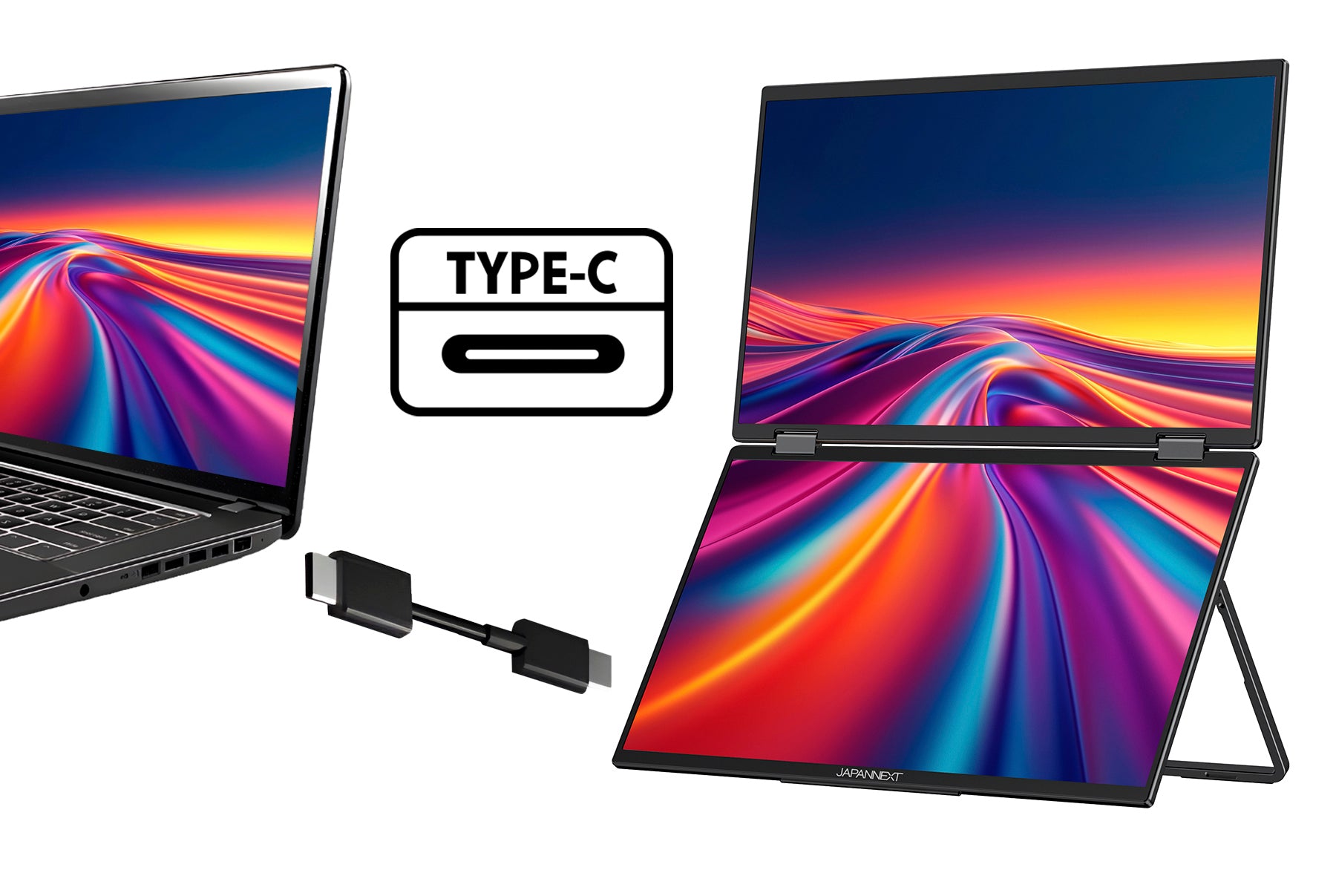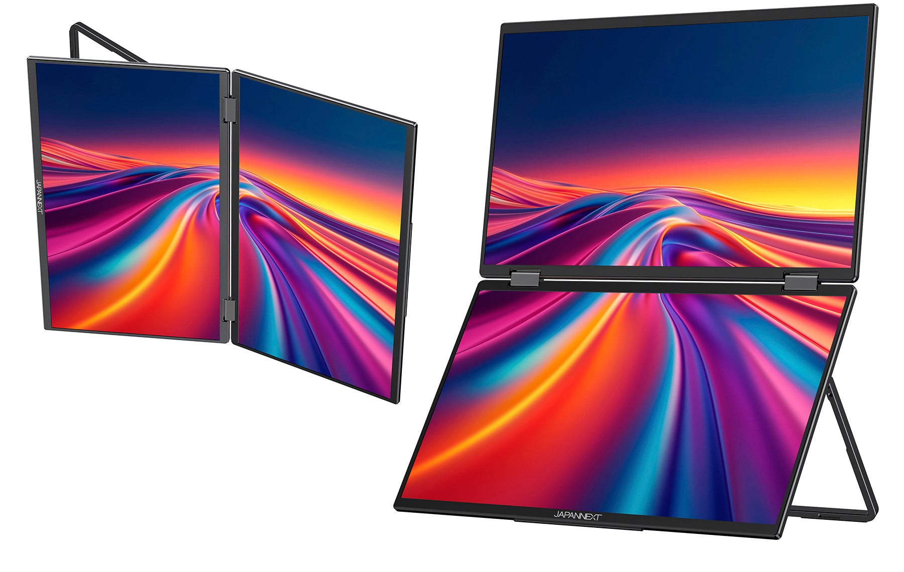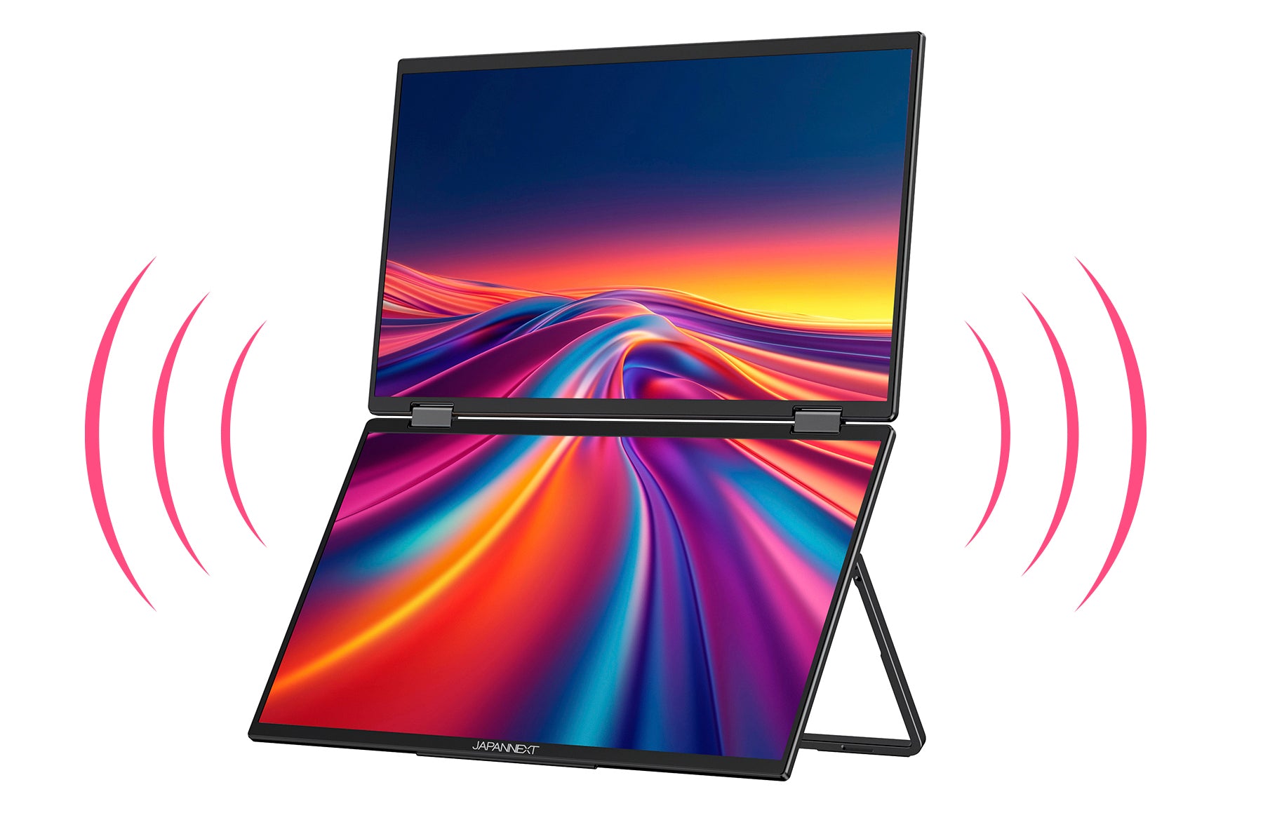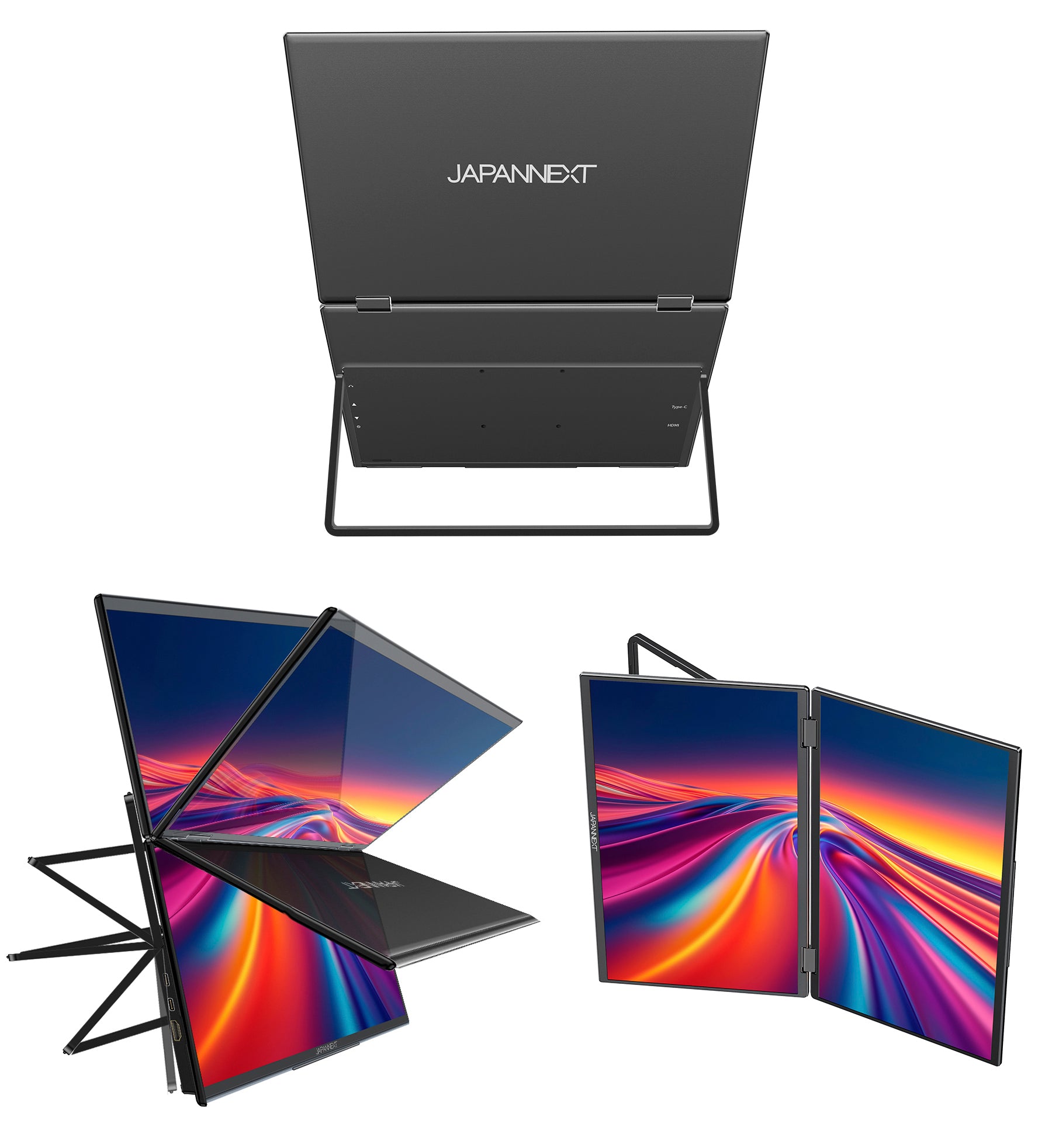 15.6インチのフルHD(1920x1080)解像度、IPSパネルを2枚搭載したデュアルモバイルディスプレイです。携帯性と機能性に優れており、ワーケーションや外出先、自宅のリビングなど、大きなディスプレイが置きづらい環境でも、USB-Cケーブル1本で簡単に最大3画面のマルチディスプレイ環境を構築できます。ノートPCのように折りたためるため、使用しない場合は収納しておくことができ、高い生産性と収納性を実現します。