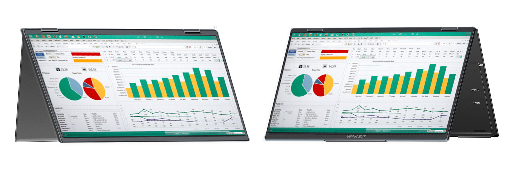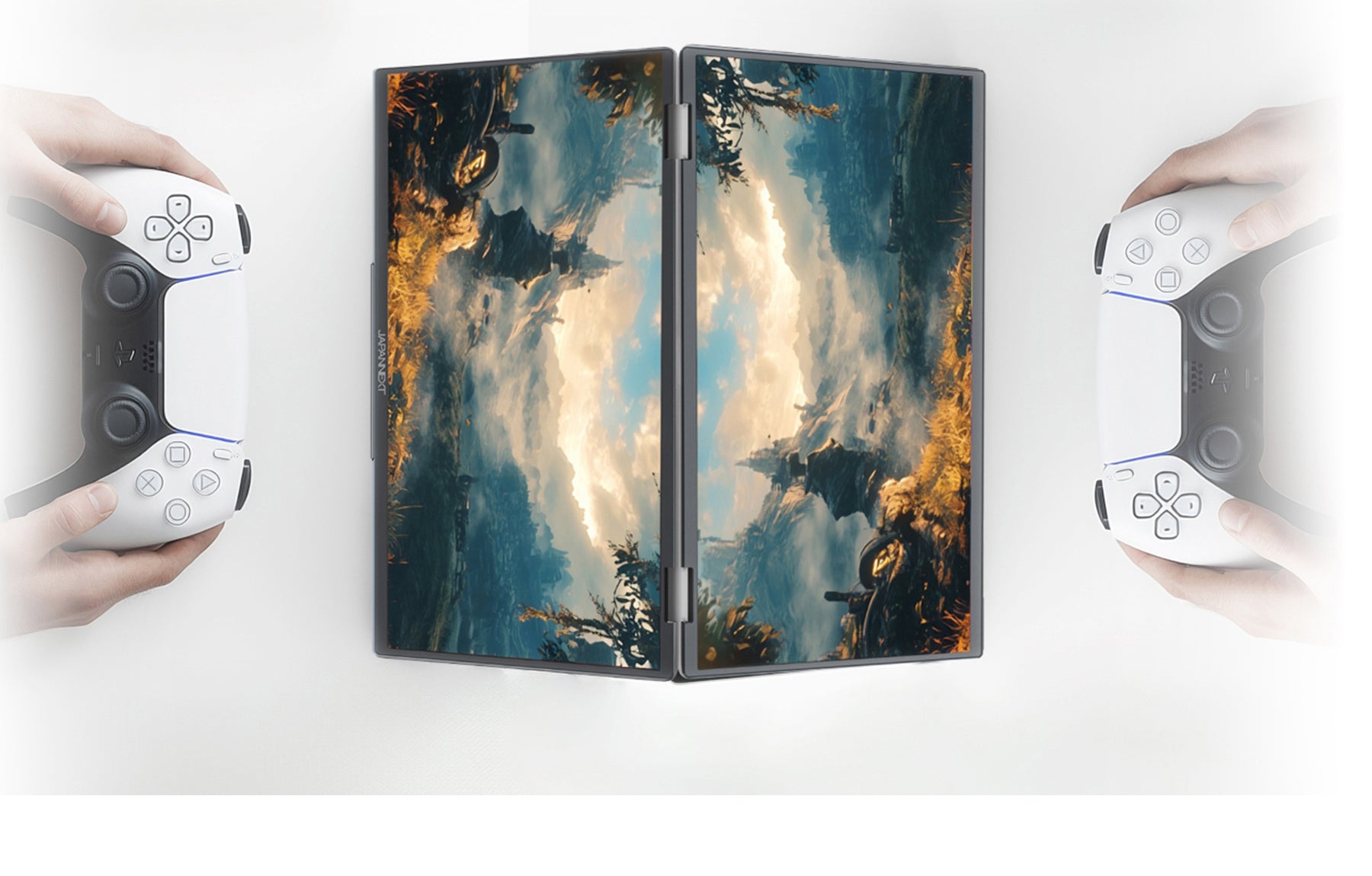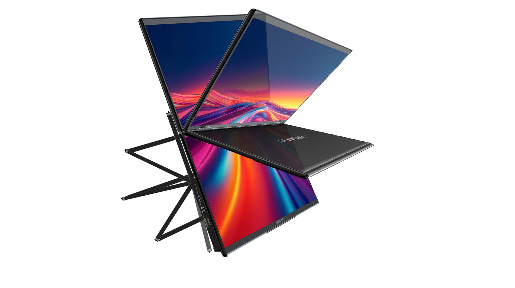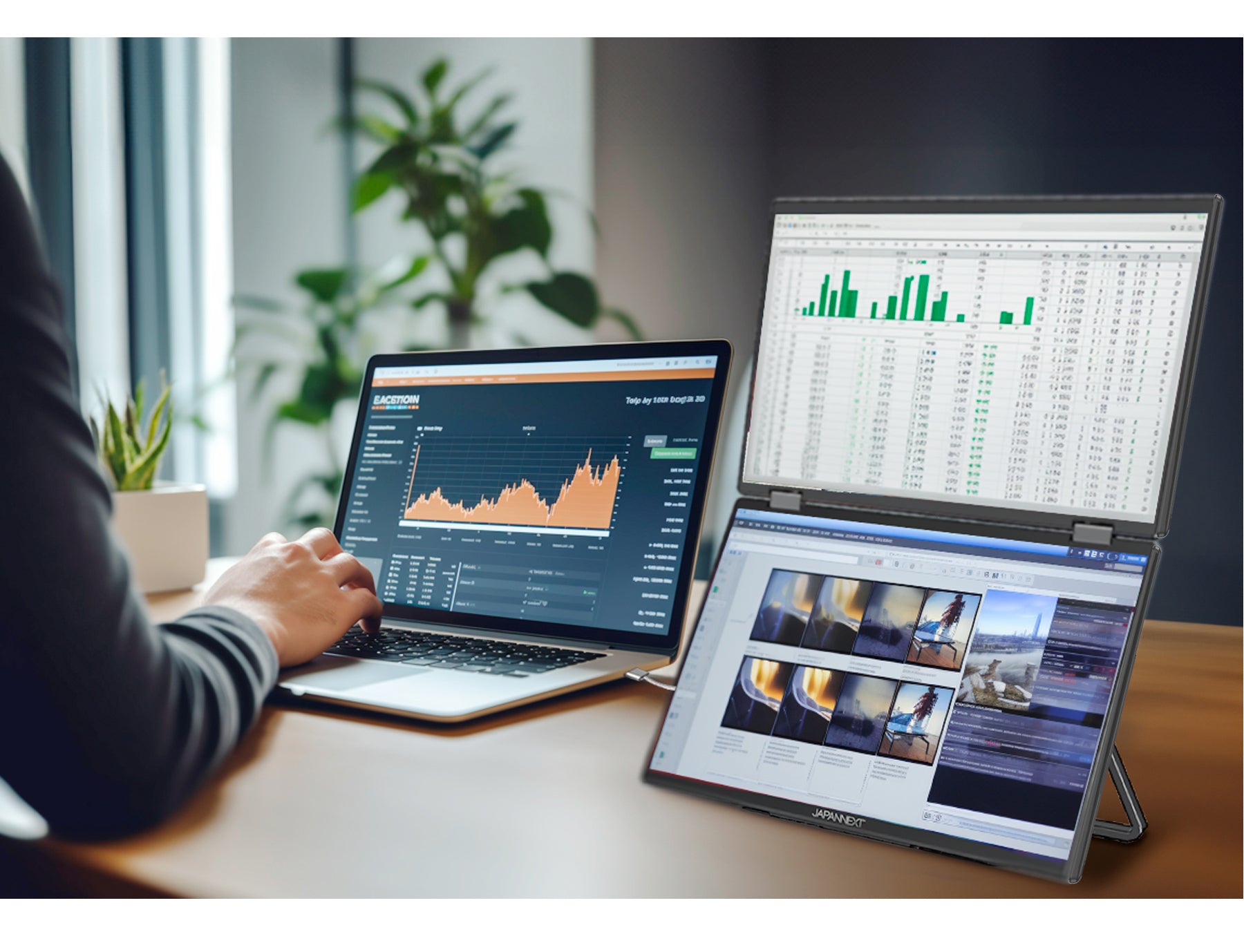 15.6インチのフルHD(1920x1080)解像度、IPSパネルを2枚搭載したデュアルモバイルディスプレイです。携帯性と機能性に優れており、ワーケーションや外出先、自宅のリビングなど、大きなディスプレイが置きづらい環境でも、USB-Cケーブル1本で簡単に最大3画面のマルチディスプレイ環境を構築できます。ノートPCのように折りたためるため、使用しない場合は収納しておくことができ、高い生産性と収納性を実現します。