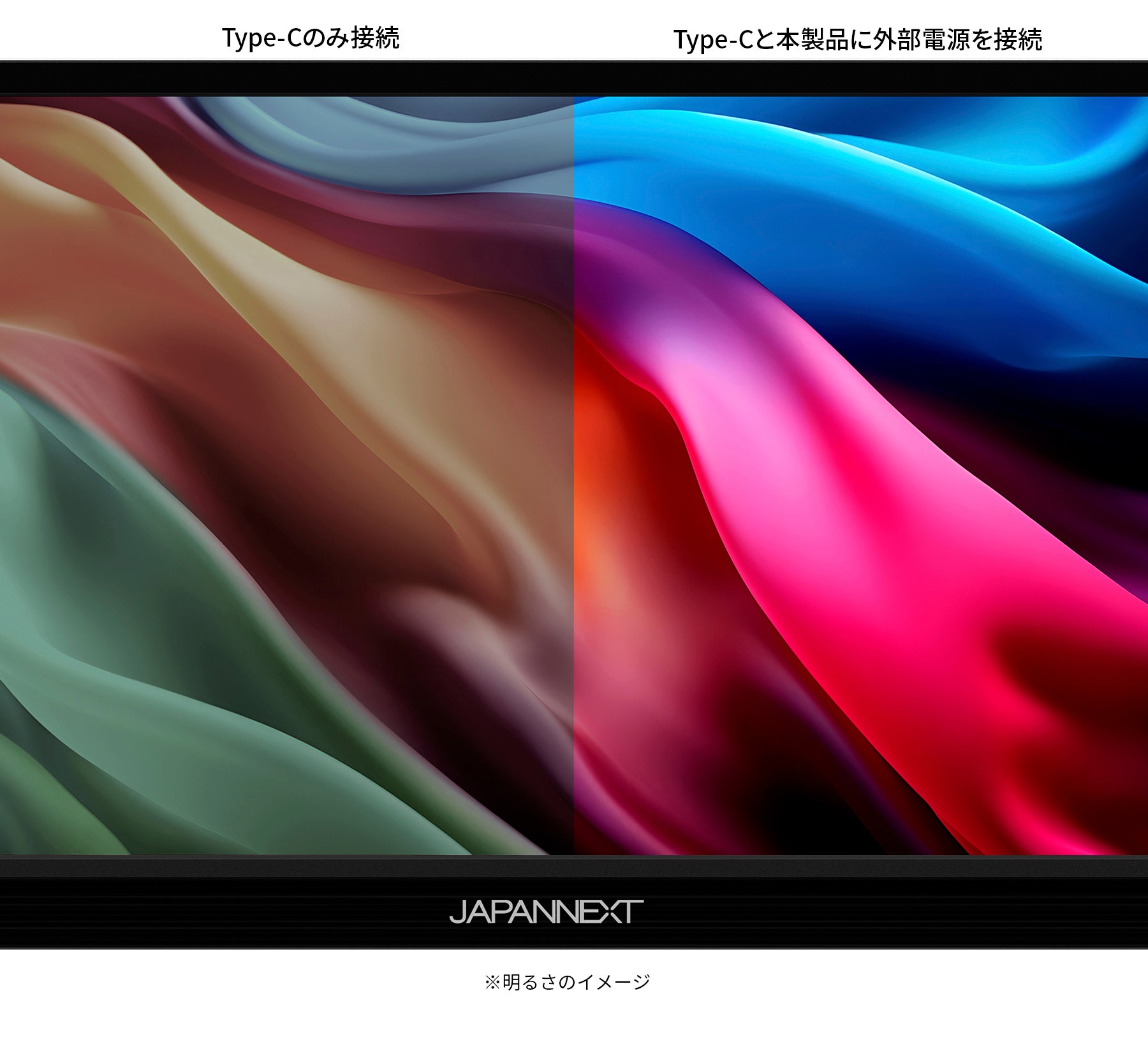 Type-C接続のみの場合、接続機種の給電能力に合わせて明るさを抑えて表示します。