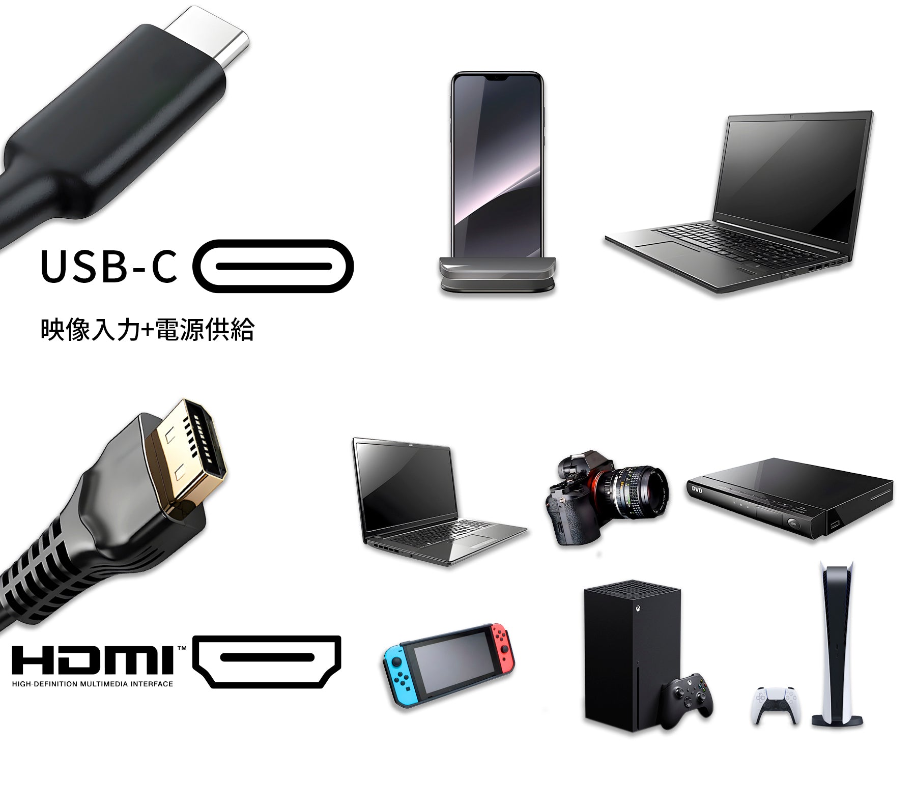 入力端子としてハイブリッド対応(モニターへの電源と映像を1本で送信)のUSB Type-Cを1つ、USB Type-C(電源供給用)を1つ、さらにHDMI 1.4を1つ装備します。*HDMI使用時にはUSB Type-C端子から電源供給が必要になります。USB Type-Cケーブル1本で電力供給と映像表示が可能となっており、ケーブルまわりがスッキリします。