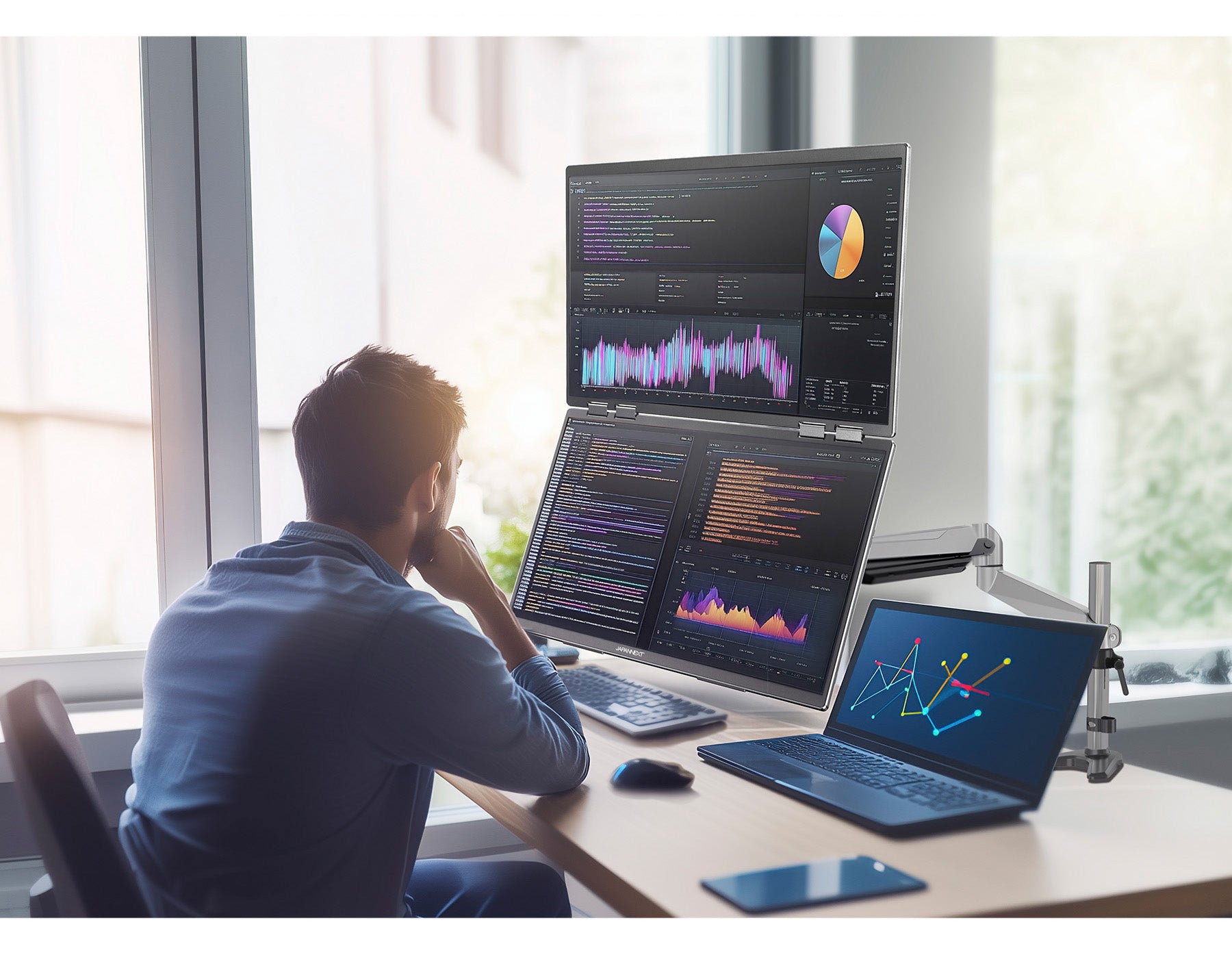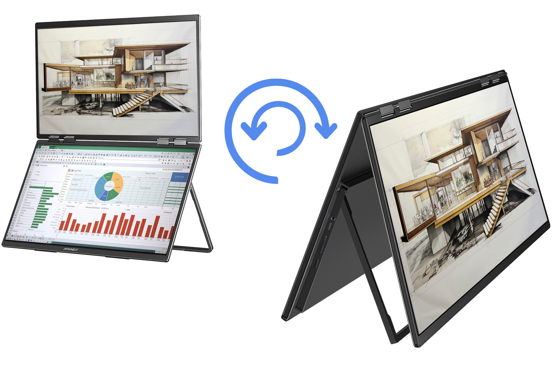 VESA対応でデスクトップでも自由自在。折りたためる大型デュアルモニターが、ワークスペースの主役です。