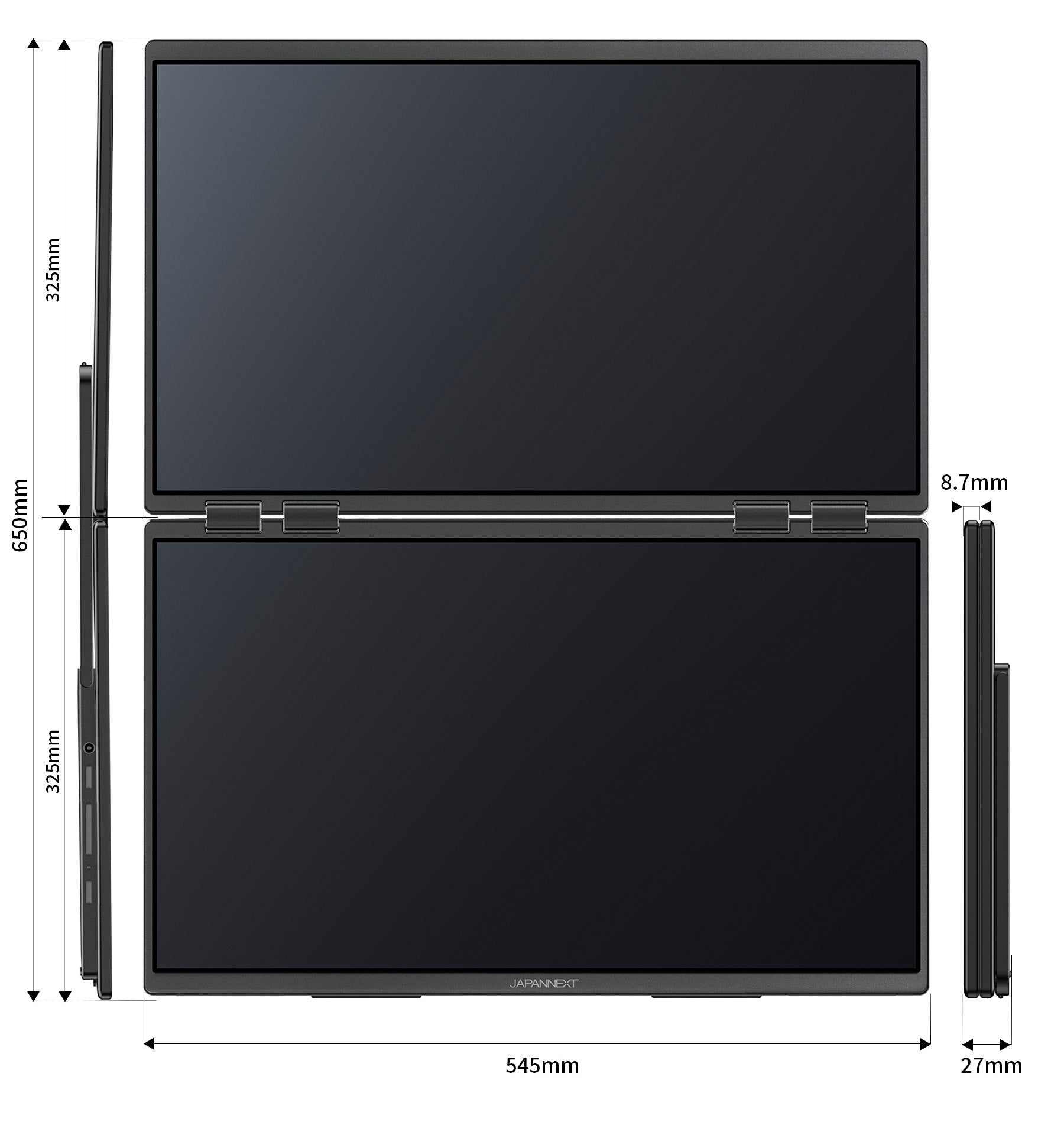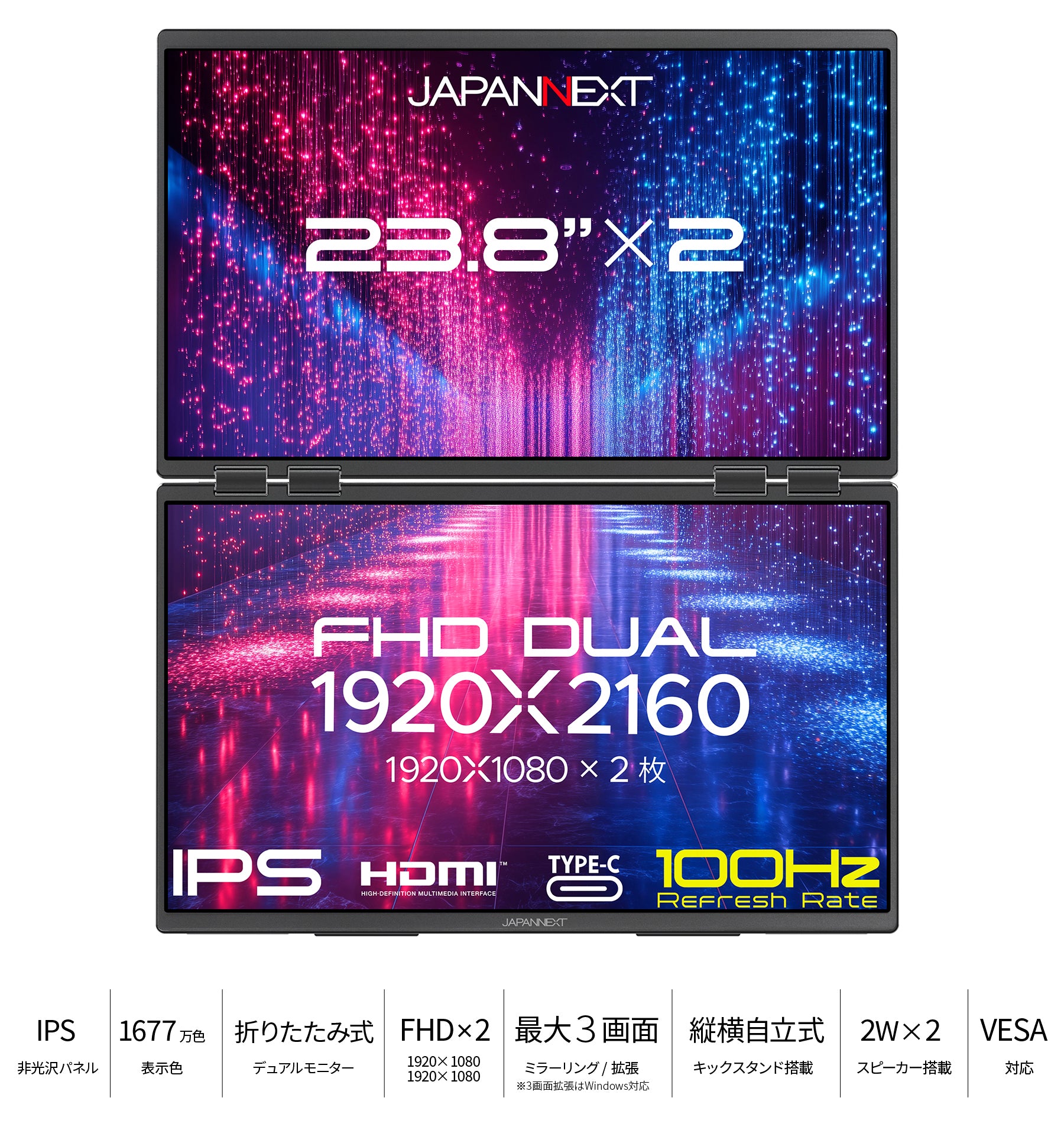 23.8インチの大画面IPSパネルを2枚搭載した、フルHD(1920×1080)解像度の大型デュアルモバイルディスプレイです。