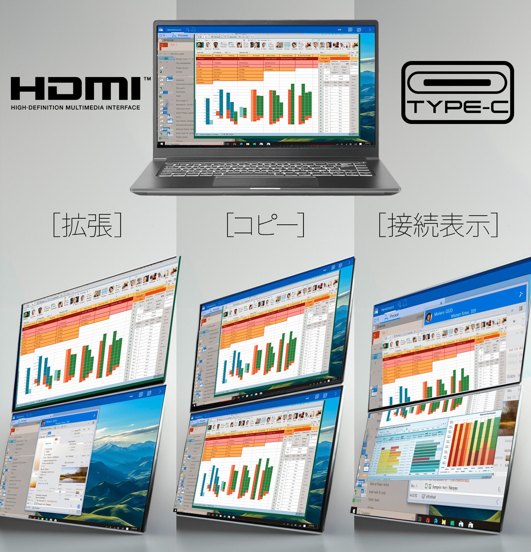 *HDMI接続時は「接続表示」モードおよび、PC本体画面と同じ映像をモバイルモニター2画面に表示する、「コピー」モードのみ対応。