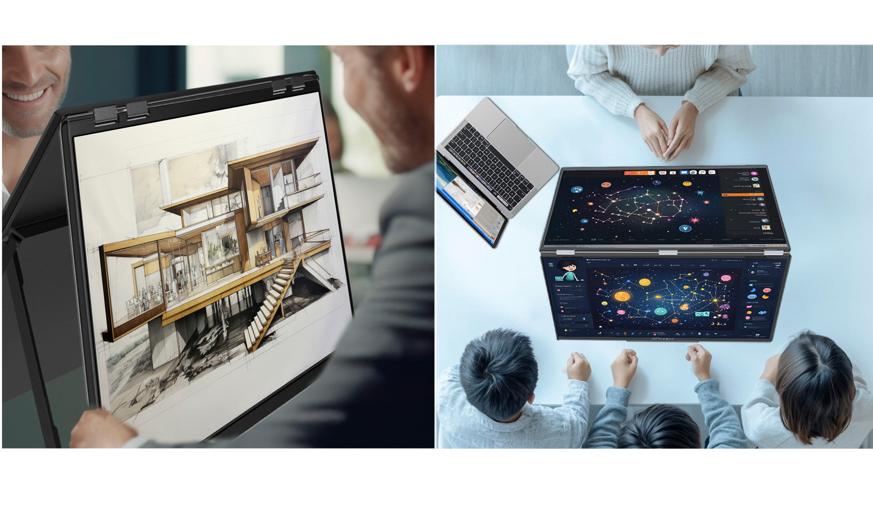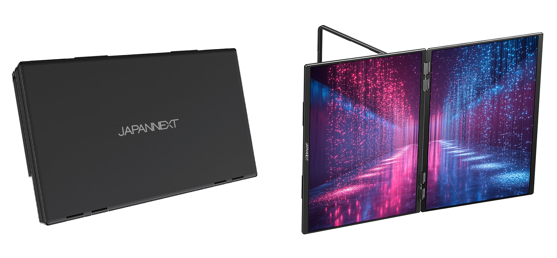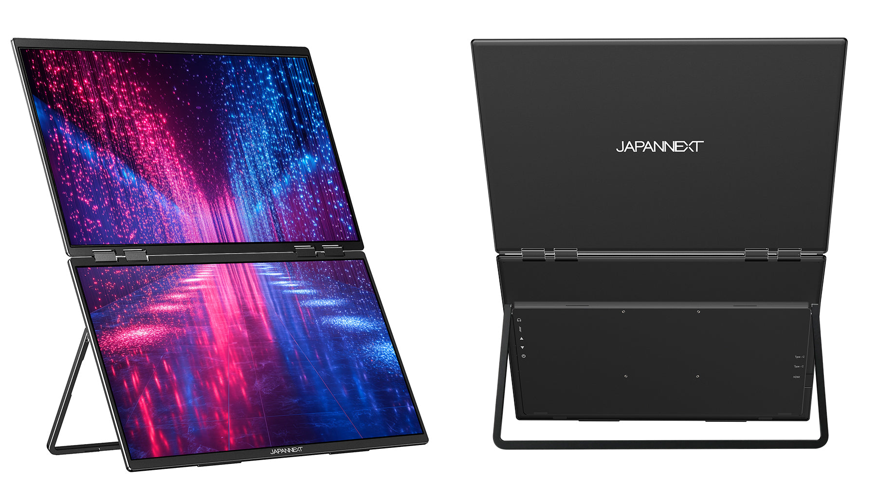 大画面のIPSパネル2枚により、迫力ある映像表示と高い作業効率を実現します。大型ディスプレイが設置しづらい場所でも、最大3画面のマルチディスプレイ環境を簡単に構築可能。ノートPCのようにスマートに折りたたんで収納できる設計で、使用しない時はコンパクトに保管できます。