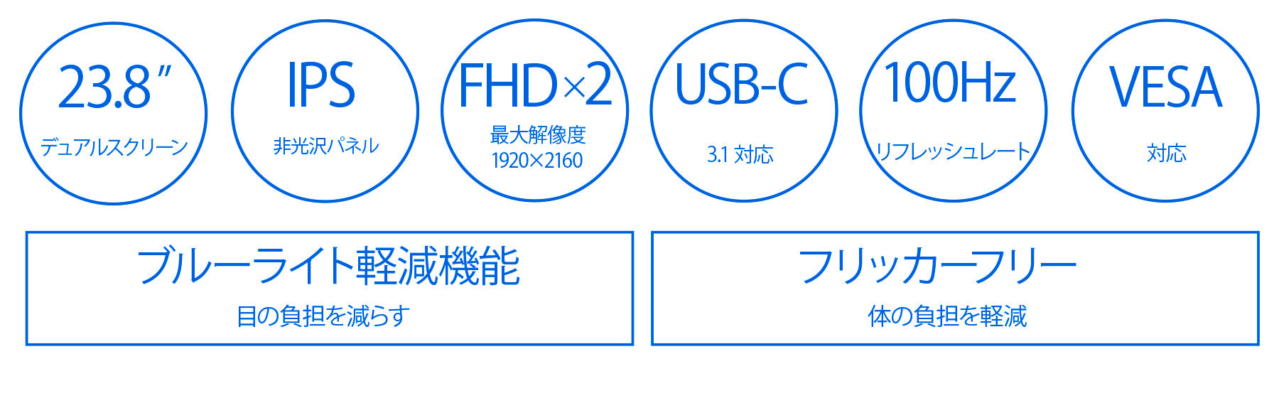 100x100mmのVESA規格に対応、モニターアームなどにも使用が可能です。フリッカー(ちらつき)フリーで、ブルーライト軽減モードを搭載し、目と身体への負担を軽減します。また、