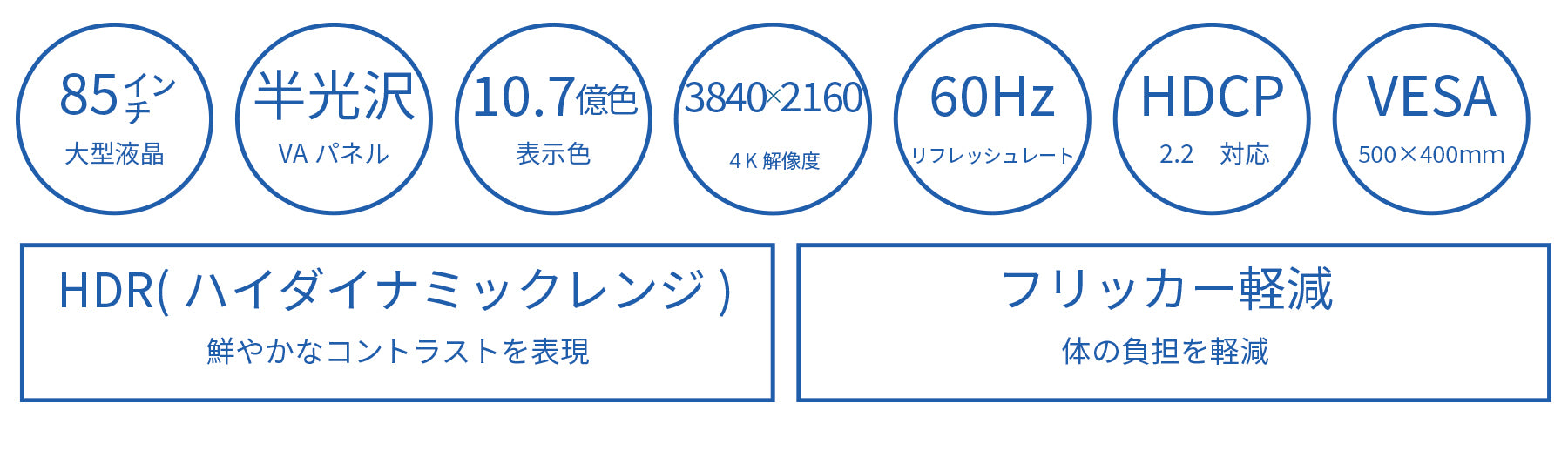 85インチの超大型で4K解像度に対応したHDR対応液晶モニターとなります。85インチの高コントラスト比VAパネルを採用し4K(3840x2160)解像度に対応、フルHD(1920×1080)の約4倍の作業領域を実現する3840×2160の高精細な表示を実現できます。