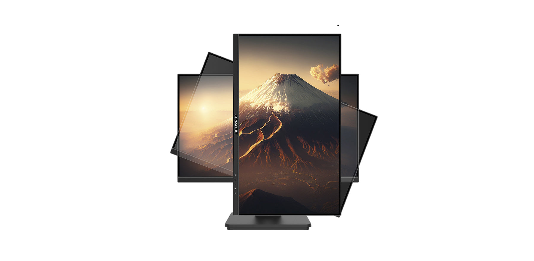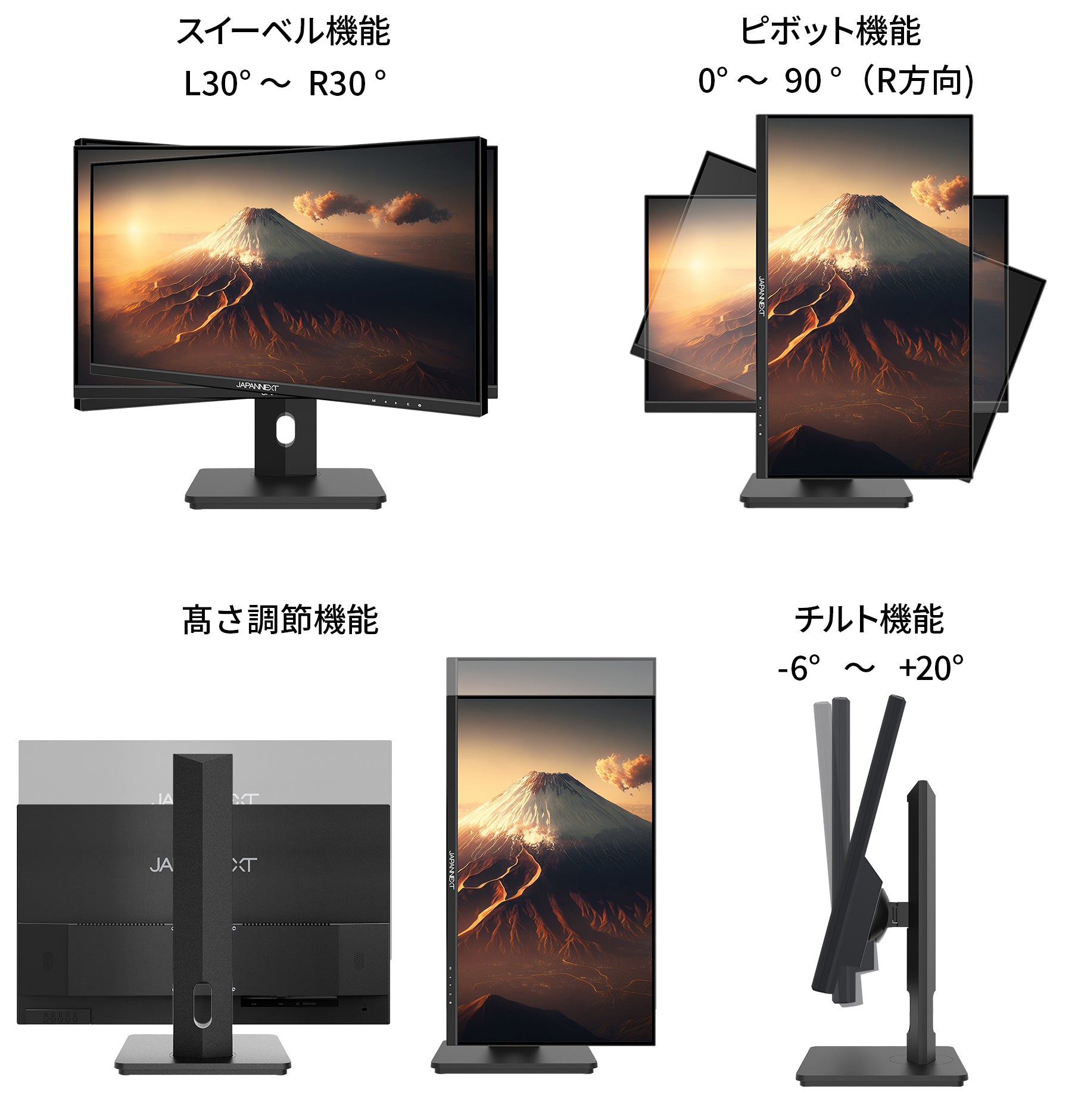 高さ調整が可能な昇降式スタンドを搭載、130mmの範囲内で最適な高さに画面を調整可能です。また縦画面として使用出来るピボット(回転)機能にも対応します。