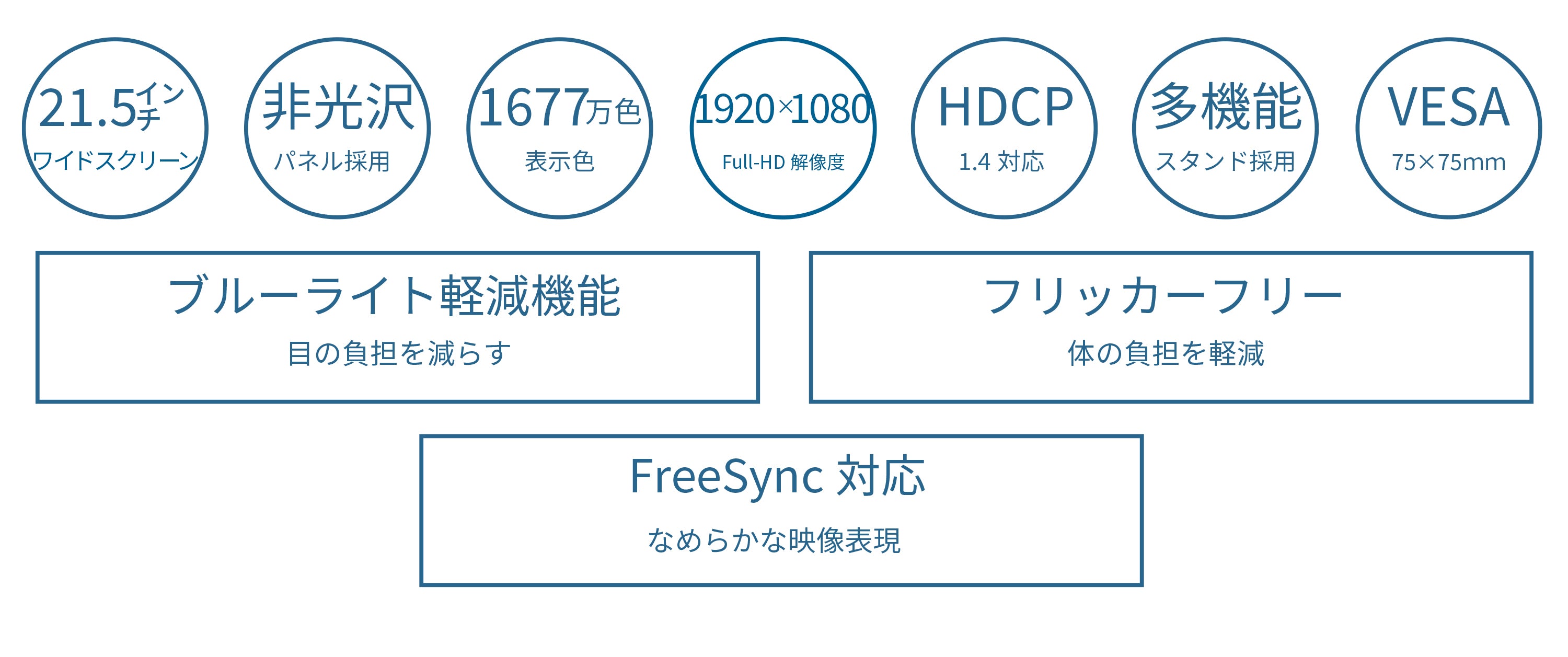 21.5インチの画面は省スペースなセカンドモニターになり、テレワークにも最適です。長時間使用時に眼に優しいフリッカーフリー(ちらつき軽減)、ブルーライト軽減モードを搭載します。
