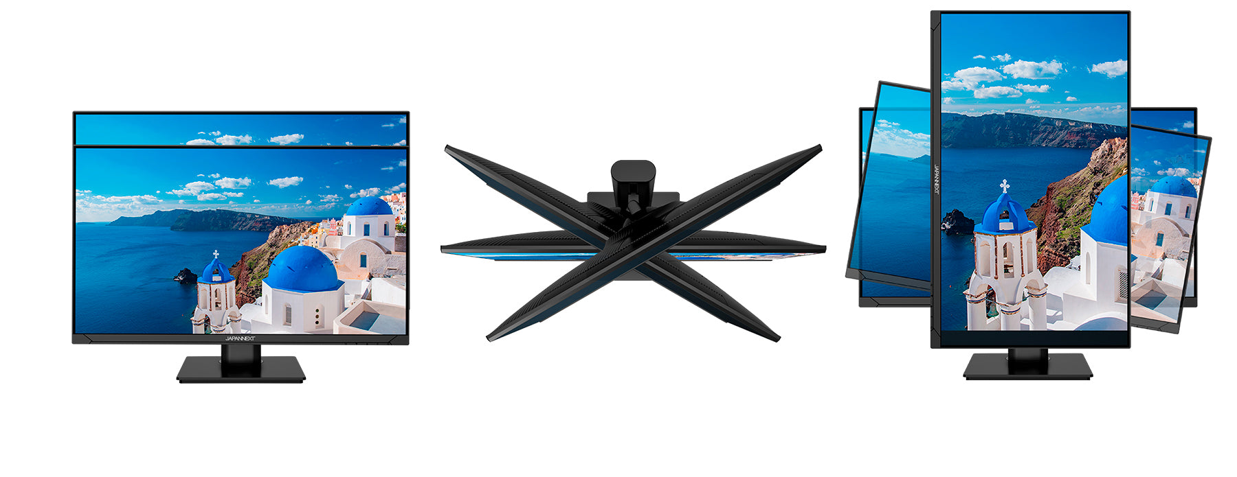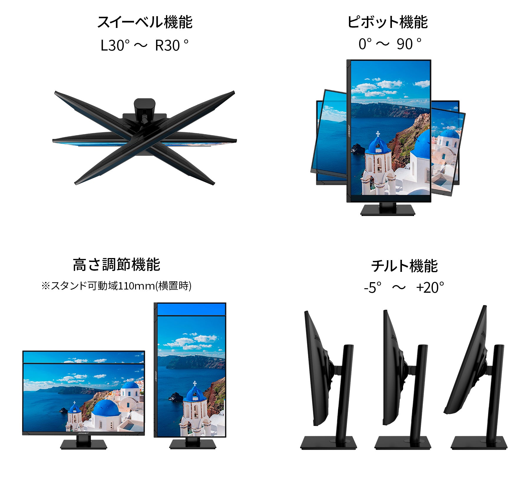 最大110mm(横置時)の範囲で高さ調整が可能な昇降式多機能スタンドを搭載。90度右に回転させての縦での使用も可能です。