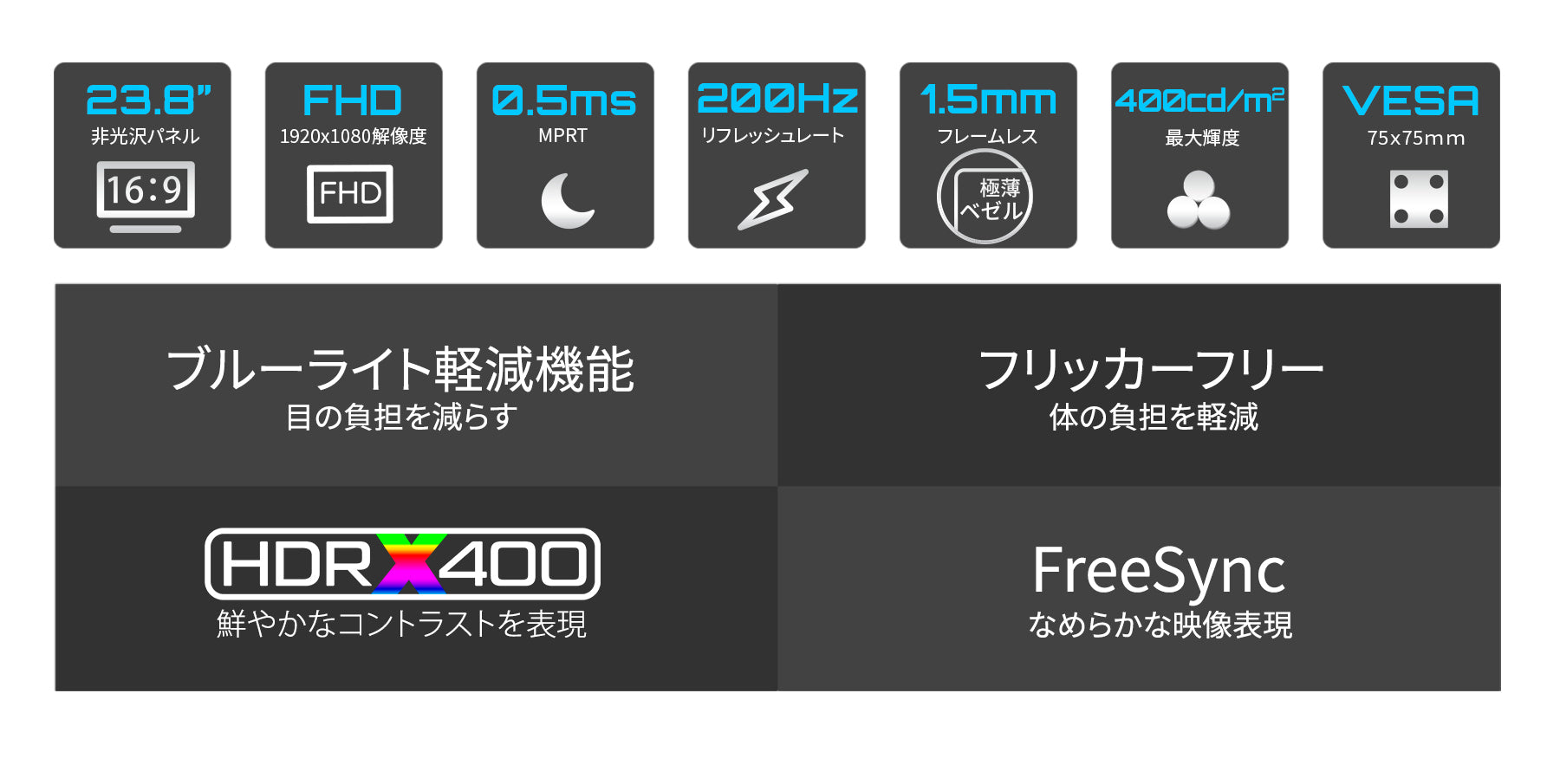 23.8インチのIPSパネルを搭載し、0.5ms(MPRT)の高速応答速度と200Hzの高速リフレッシュレートに対応した、フルHD(1920x1080)解像度のゲーミングモニターです。