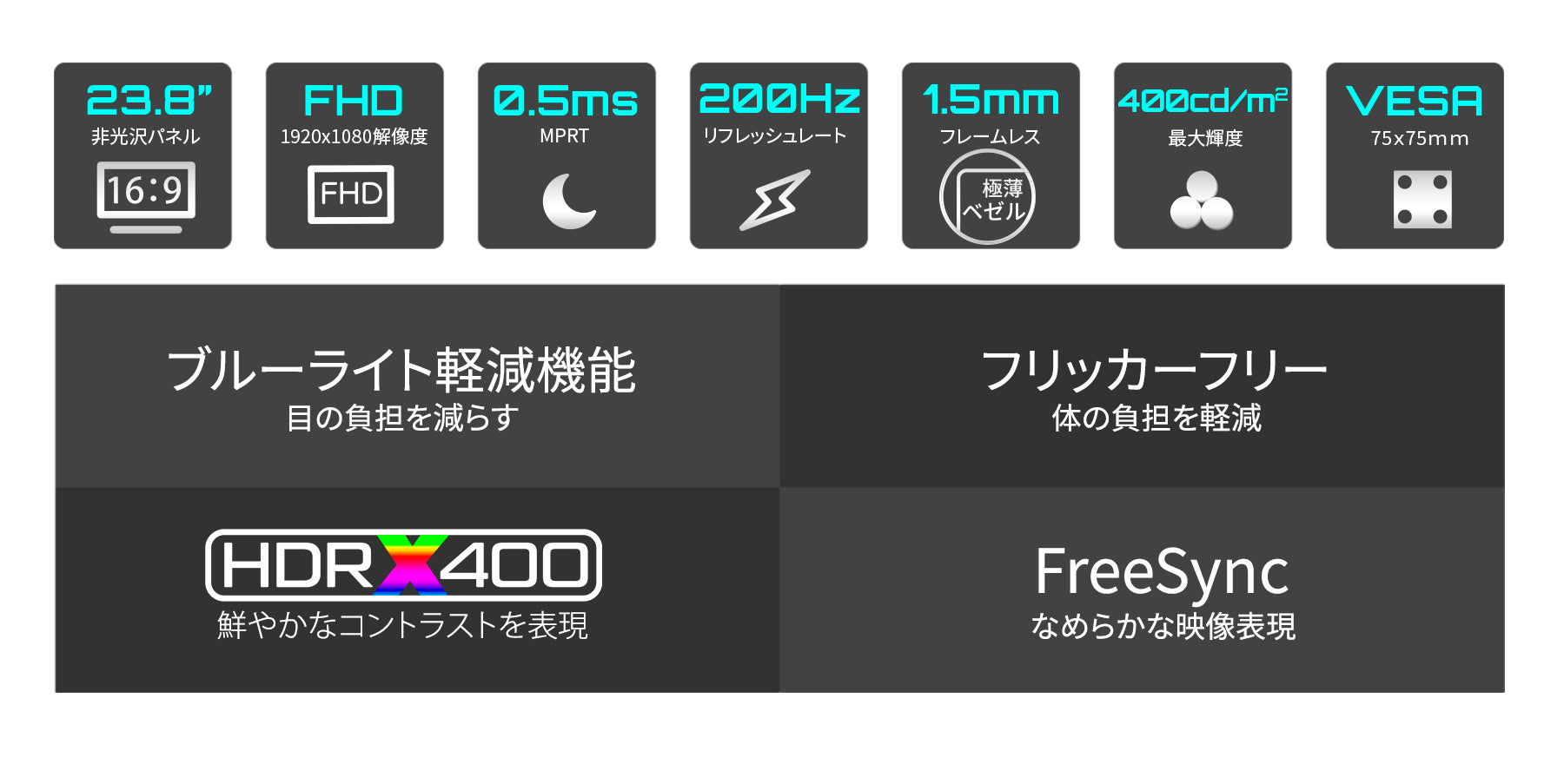23.8インチのIPSパネルを搭載し、0.5ms(MPRT)の高速応答速度と200Hzの高速リフレッシュレートに対応した、フルHD(1920x1080)解像度のゲーミングモニターです。