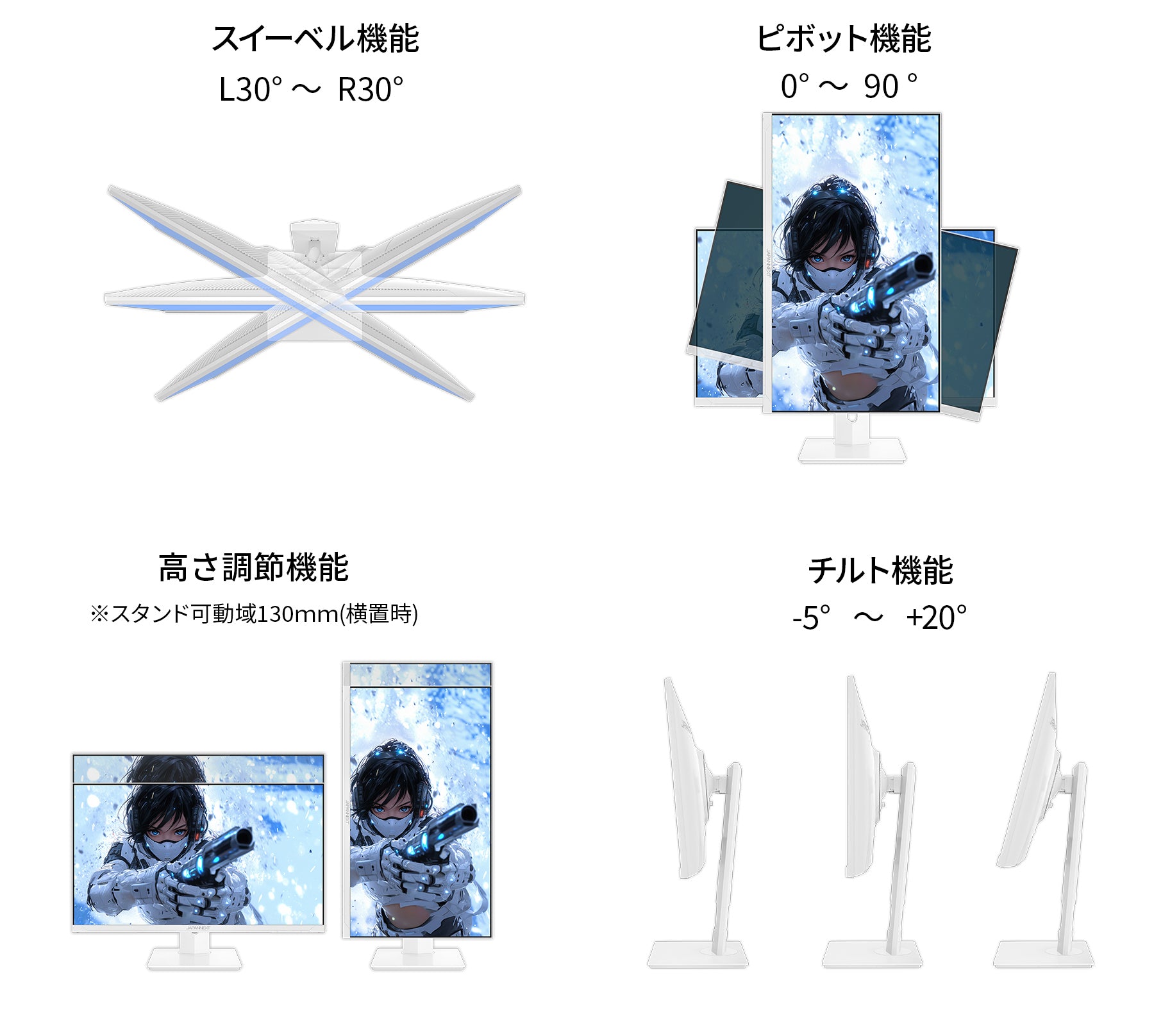 昇降式多機能スタンドを搭載。最大130mmの範囲(横置時)で最適な高さに画面を調整可能です。また縦画面として使用出来るピボット(回転)機能にも対応します。スイーベル(首振り)機能は(L30°R30°)の範囲で動かすことが可能です。