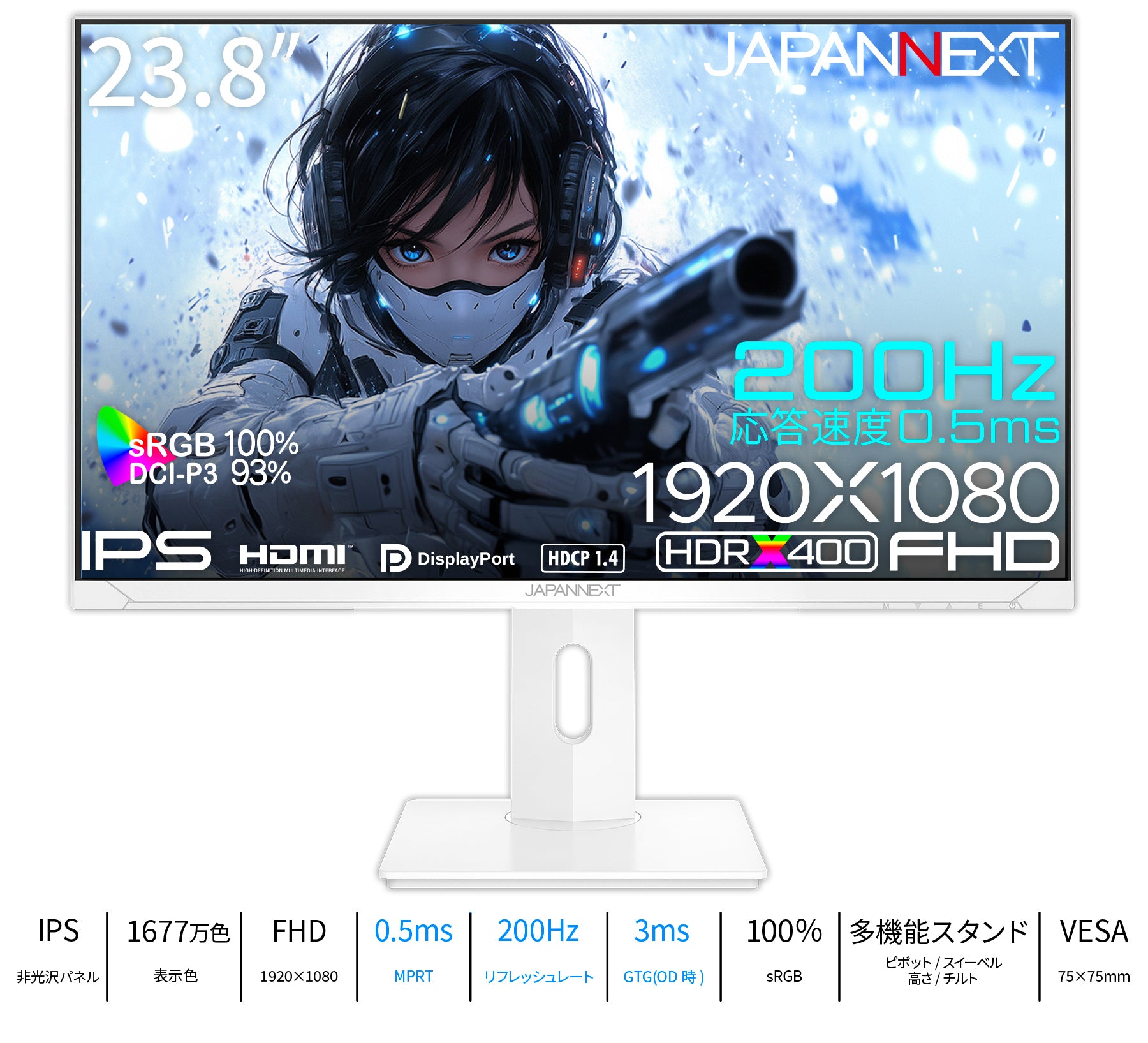 200Hz/MPRT0.5ms ホワイトカラーの高速ゲーミング