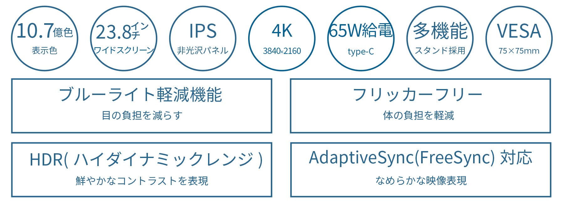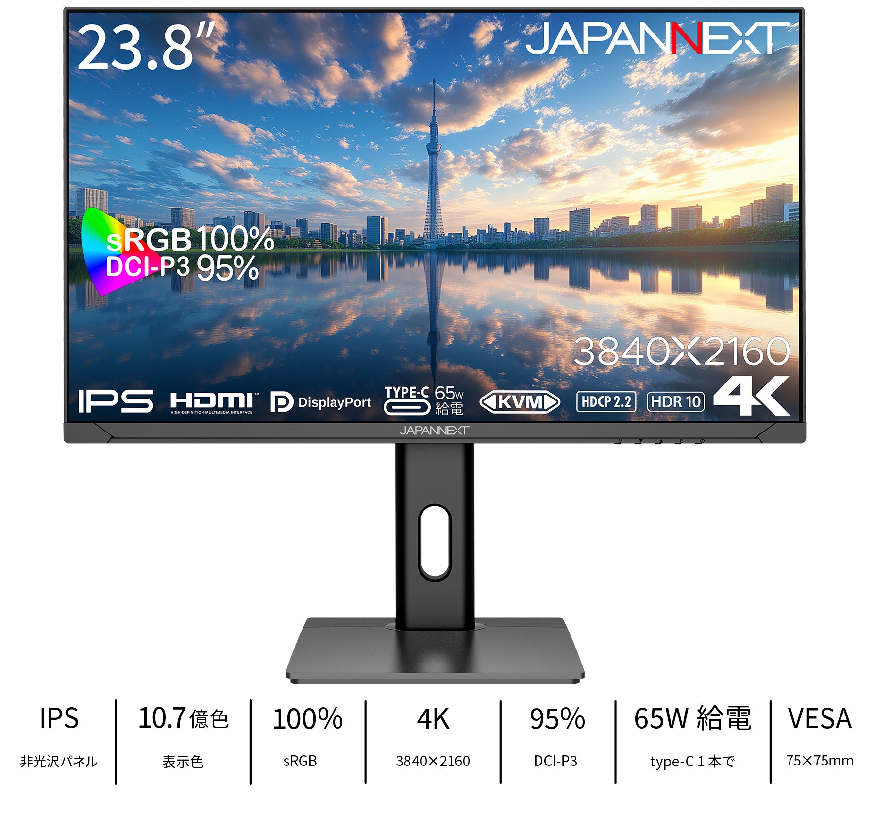 23.8インチのコンパクトサイズと4K(3840x2160)の高解像度を両立した省スペースながらも快適なデスク環境を実現した液晶モニターです。