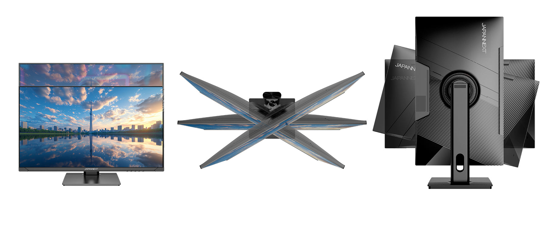 高さ調整が可能な昇降式多機能スタンドを搭載、最大150mmの範囲(横置時)で最適な高さに画面を調整可能です。また、縦画面として使用出来るピボット(回転)機能にも対応します。スイーベル(首振り)機能は、左右各30°の範囲で動かせます。
